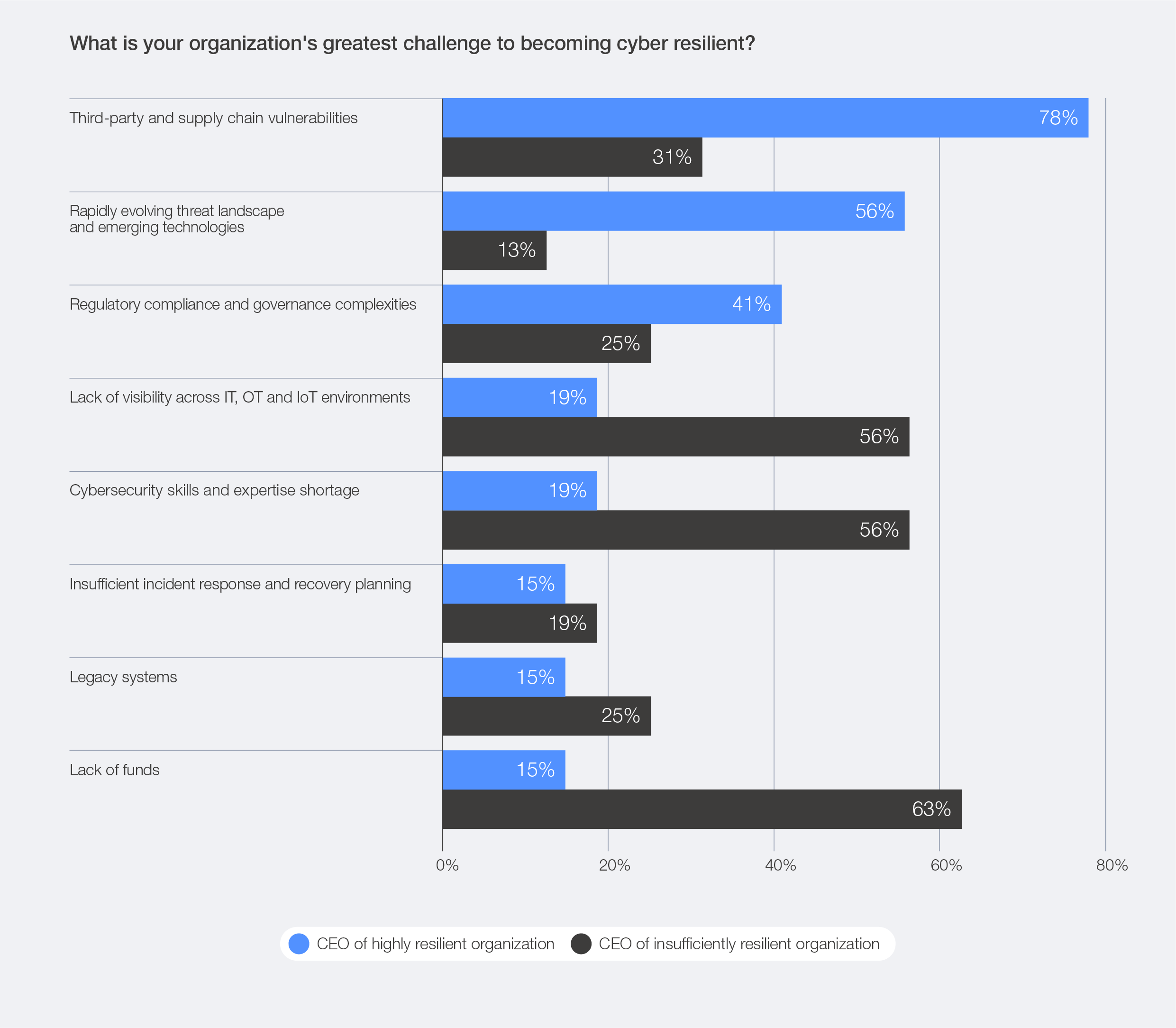 CEOs of highly resilient organizations cite external ecosystem risks as the top challenge to cyber resilience, while less resilient peers point to funding and skills shortages