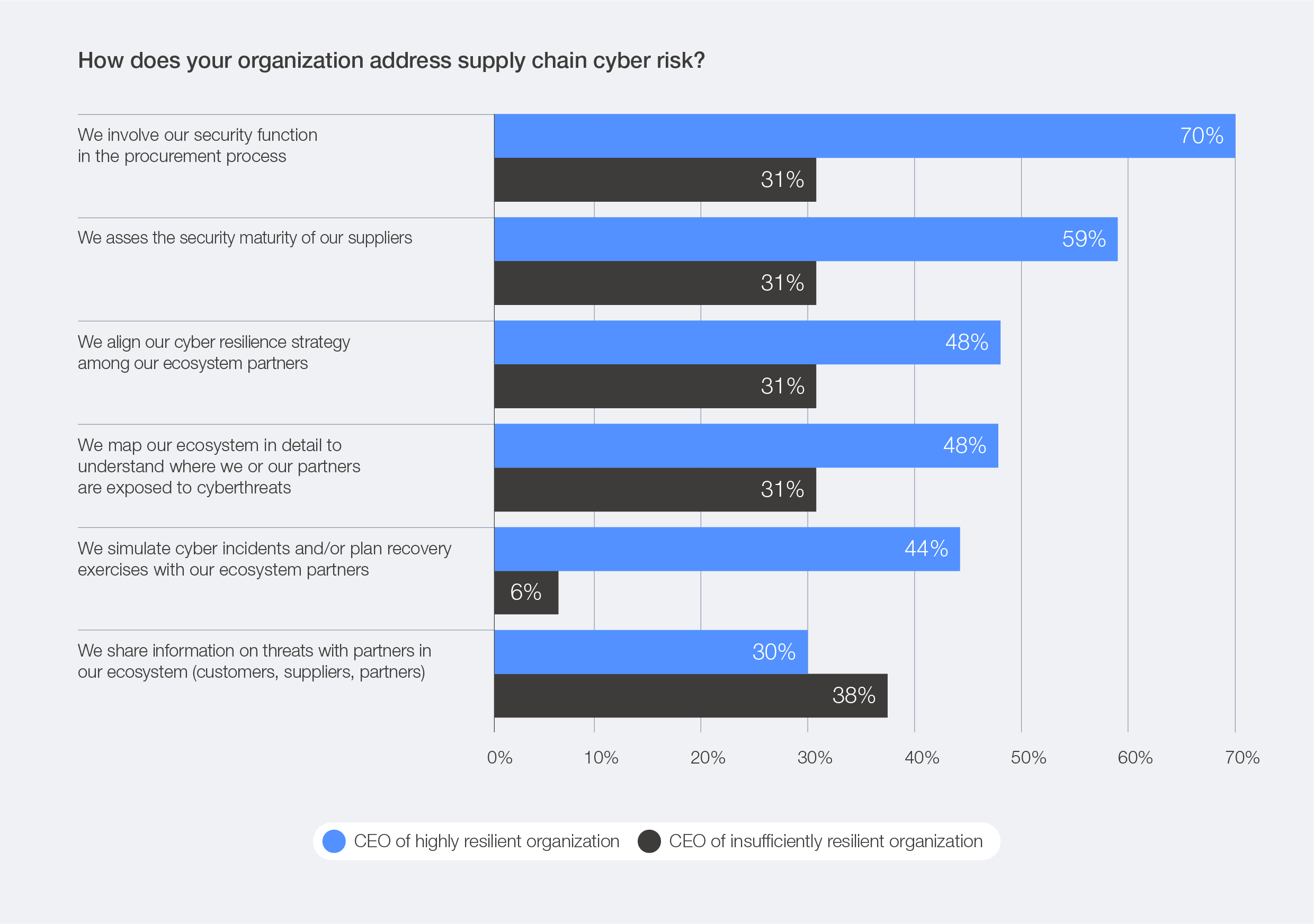 CEOs of highly resilient organizations integrate security into their procurement process (70%) and prioritize supplier-maturity assessments (59%) to address supply chain risk.