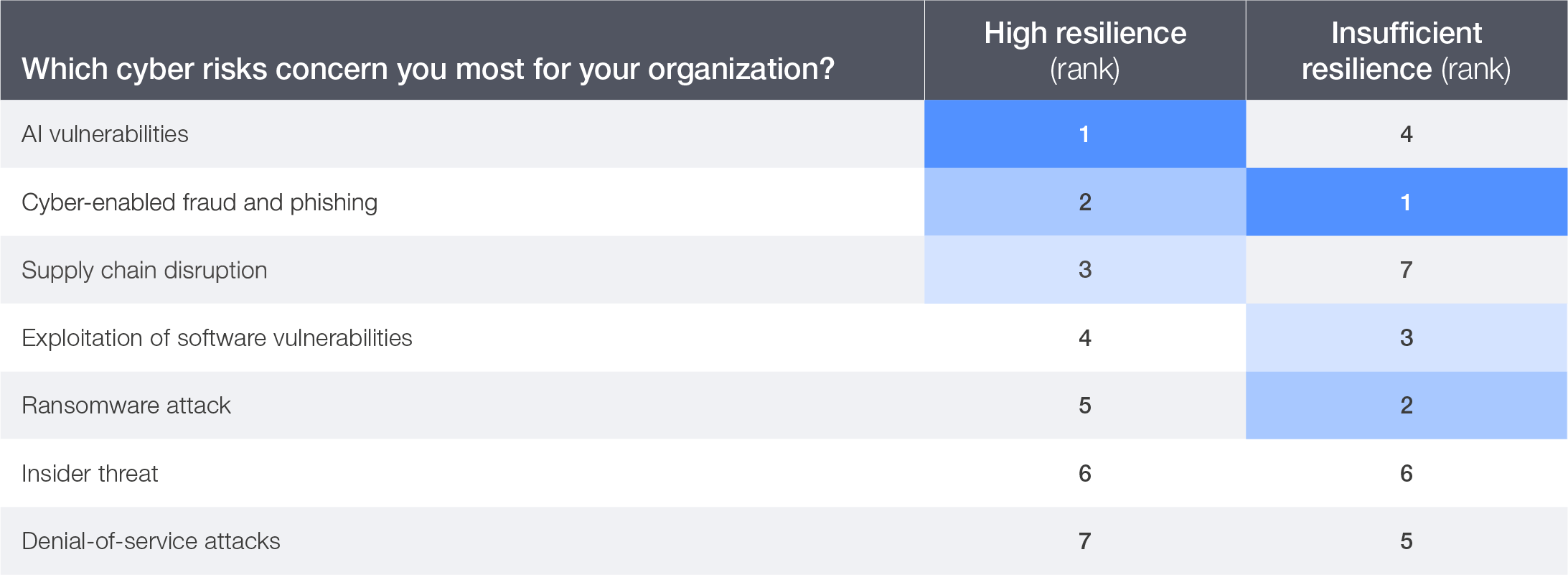 Cyber-enabled fraud and phishing remain the top cybersecurity concerns for CEOs of insufficiently resilient organizations. However, as resilience strengthens, risk perception shifts towards emerging threats: among CEOs of highly resilient organizations, AI-related vulnerabilities rise to the top. This suggests that resilient organizations are more attuned to the evolving risks posed by advanced technologies.