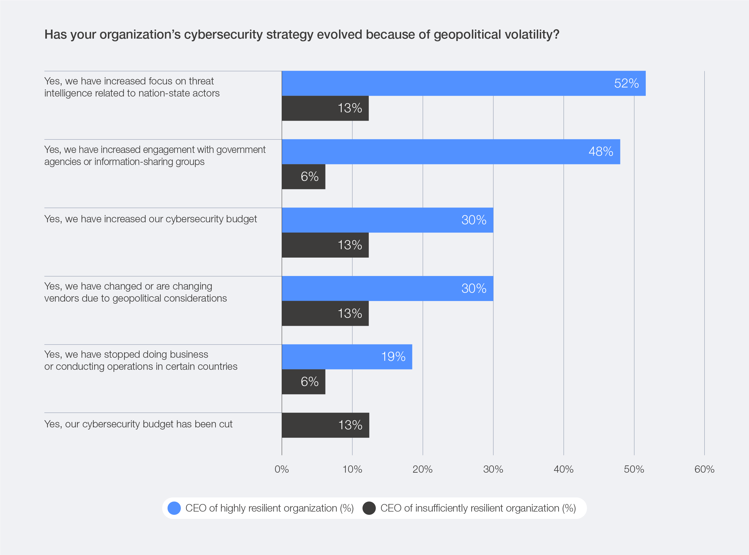 Figure 3: CEOs' views on the evolution of cybersecurity strategy amid geopolitical volatility, by organizational resilience level