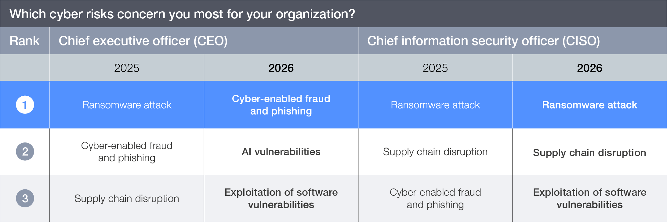 In 2025, CEOs were most concerned about ransomware attacks, followed by cyber-enabled fraud. In 2026, their priorities shifted, with cyber-enabled fraud and phishing taking the top spot and AI vulnerabilities emerging second. For CISOs, the top risks showed strong continuity, with ransomware attacks remaining the leading concern and supply chain disruption consistently holding second place across both years. This suggests CEOs are prioritizing financial loss prevention and preparing for new threats, while CISOs remain focused on operational resilience.