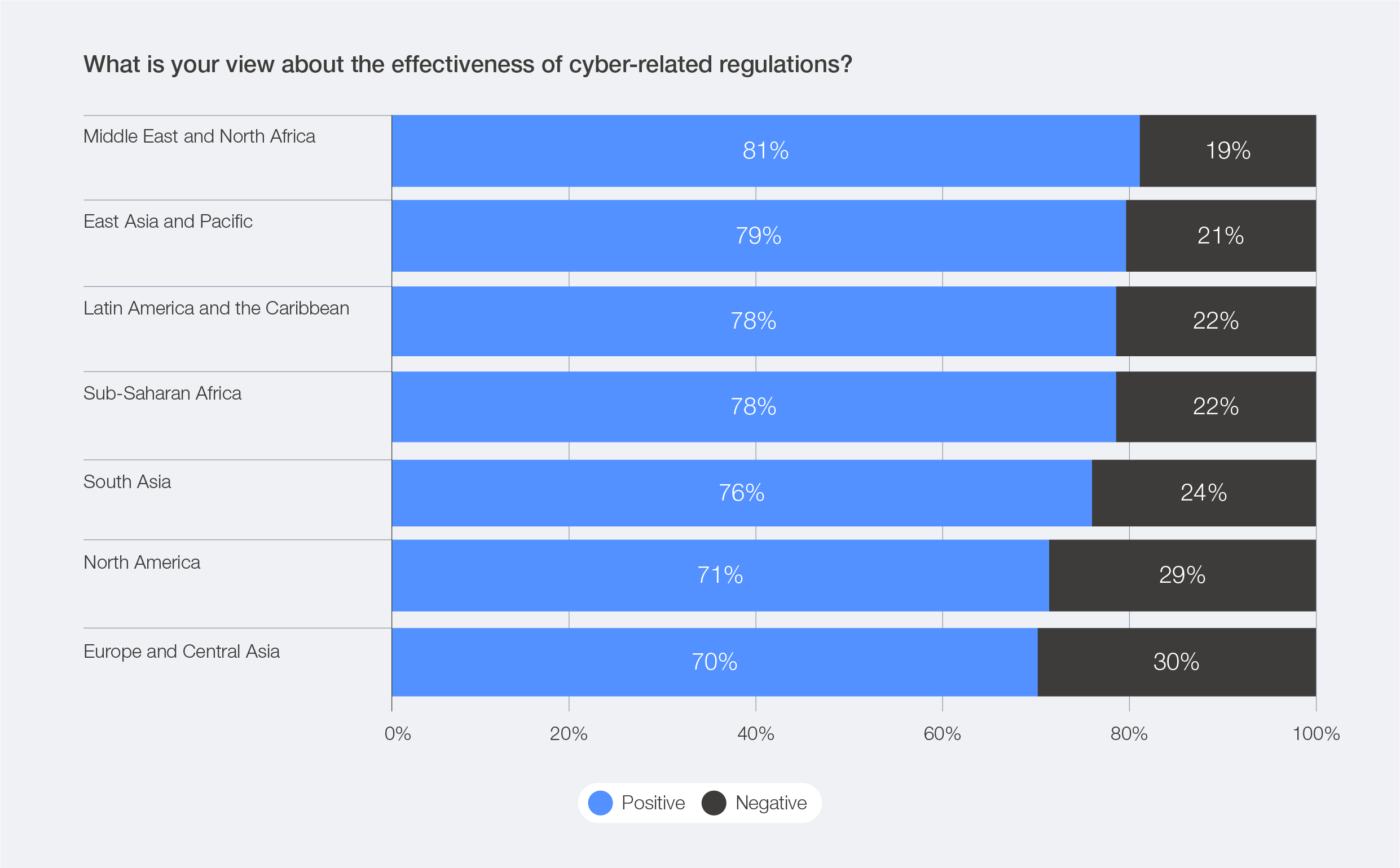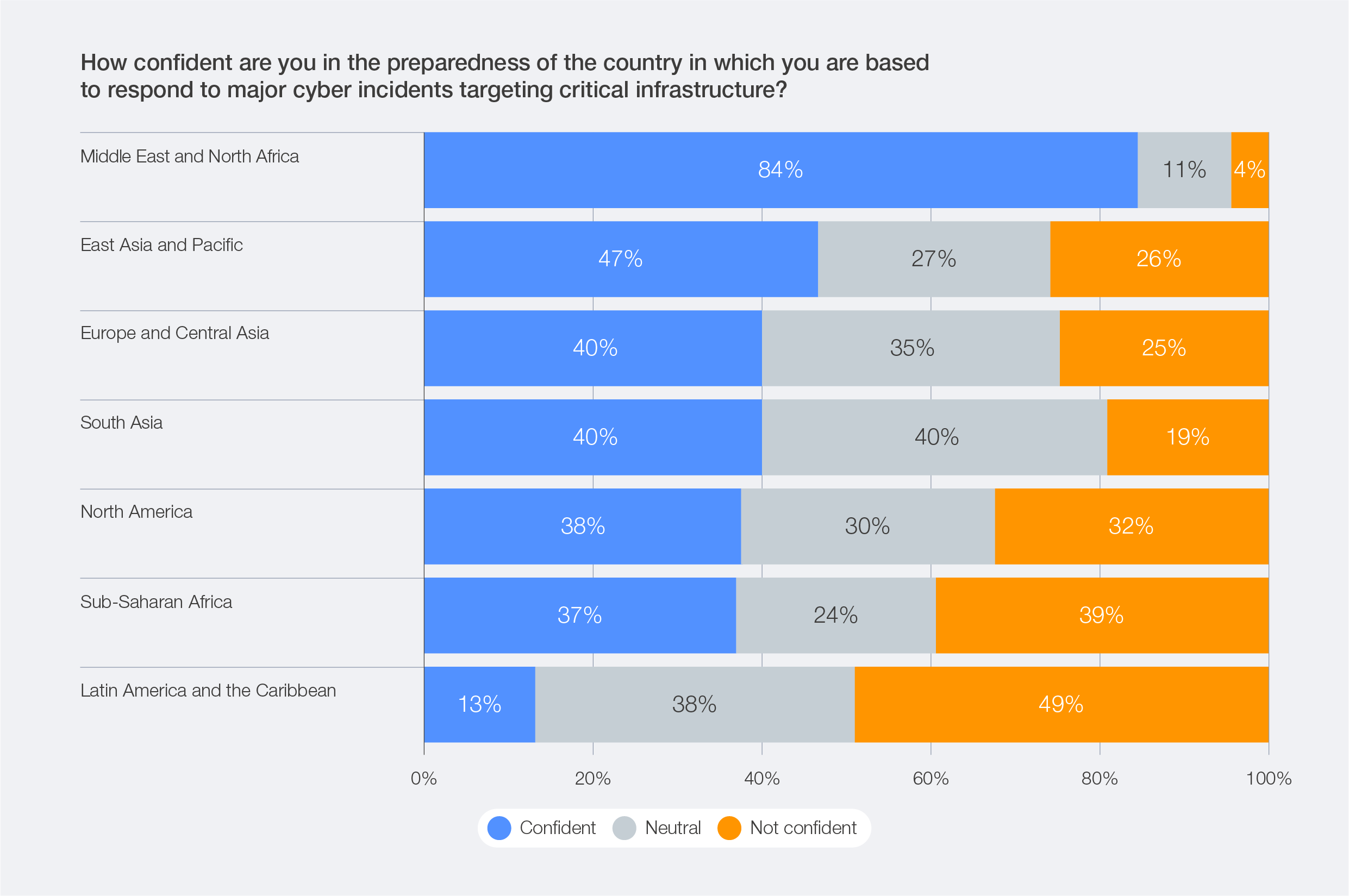 Respondents’ perceptions of their country’s ability to protect critical national infrastructure vary significantly across regions. While a high degree of confidence is expressed by respondents from the Middle East and North Africa (84% of respondents), far less confidence is expressed by respondents based in Latin America and the Caribbean (13%).