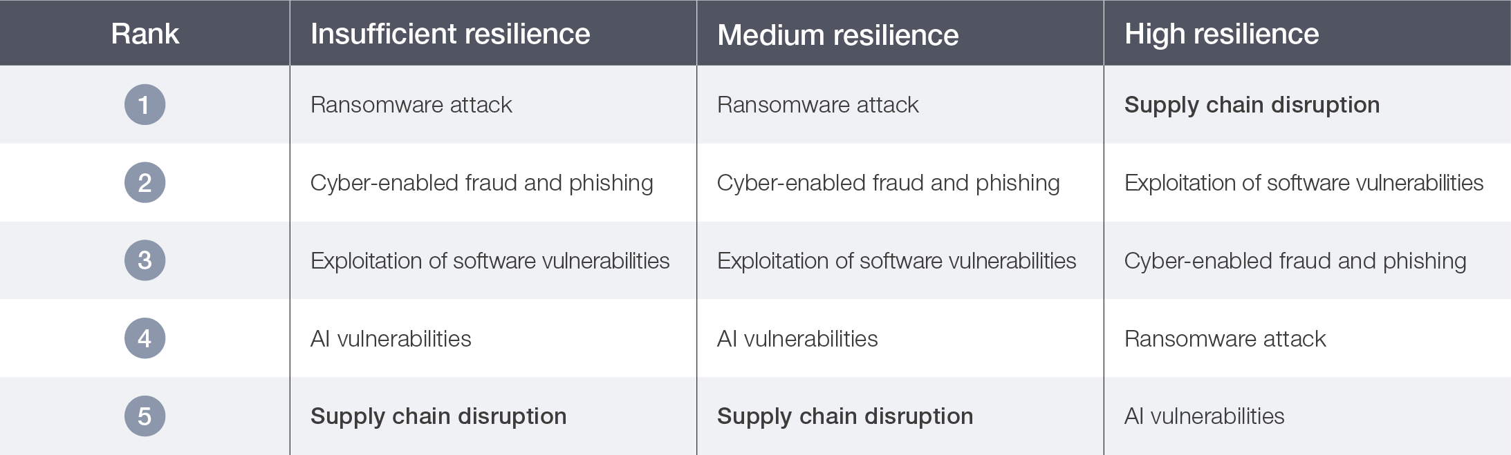 Moreover, highly resilient organizations demonstrate a broader risk perspective, focusing not only on their internal posture but also on external dependencies across their ecosystem. Survey data shows that supply chain exposure ranks as the top cyber risk concern among high-resilience organizations, whereas moderately resilient and insufficiently resilient organizations ranked it only fifth (see Table 5). This suggests that more mature organizations are increasingly recognizing that their resilience depends as much on the strength of their partners as on their own defences.