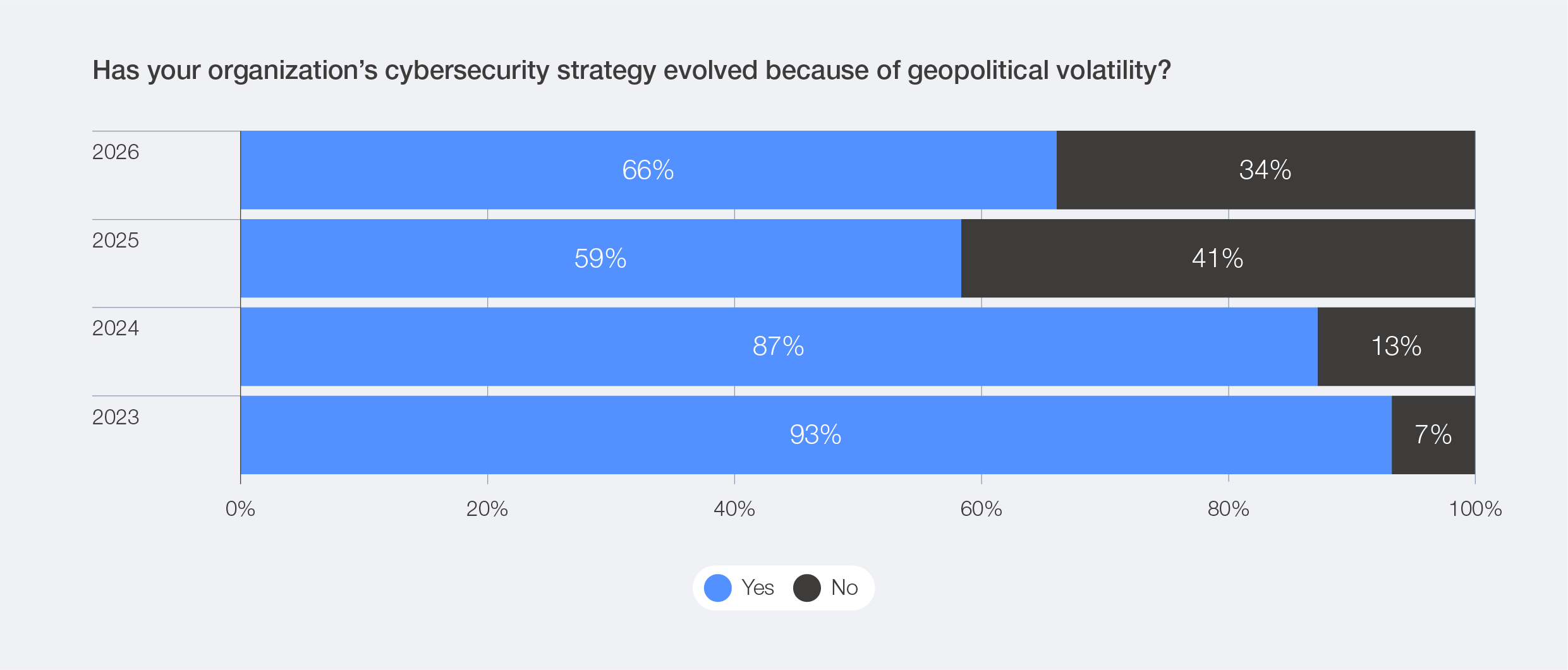 The Global Cybersecurity Outlook 2026 survey data reveals that, although the percentage of organizations changing their cybersecurity strategy due to geopolitics has declined from 93% in 2023 to 66% in 2026, geopolitics remains the top factor influencing overall cyber risk mitigation strategies. This suggests that the initial wave of adaptations following the geopolitical turmoil that dominated the headlines in 2022 and 2023 has passed, and that geopolitical risk is now a major factor shaping cyber defence.