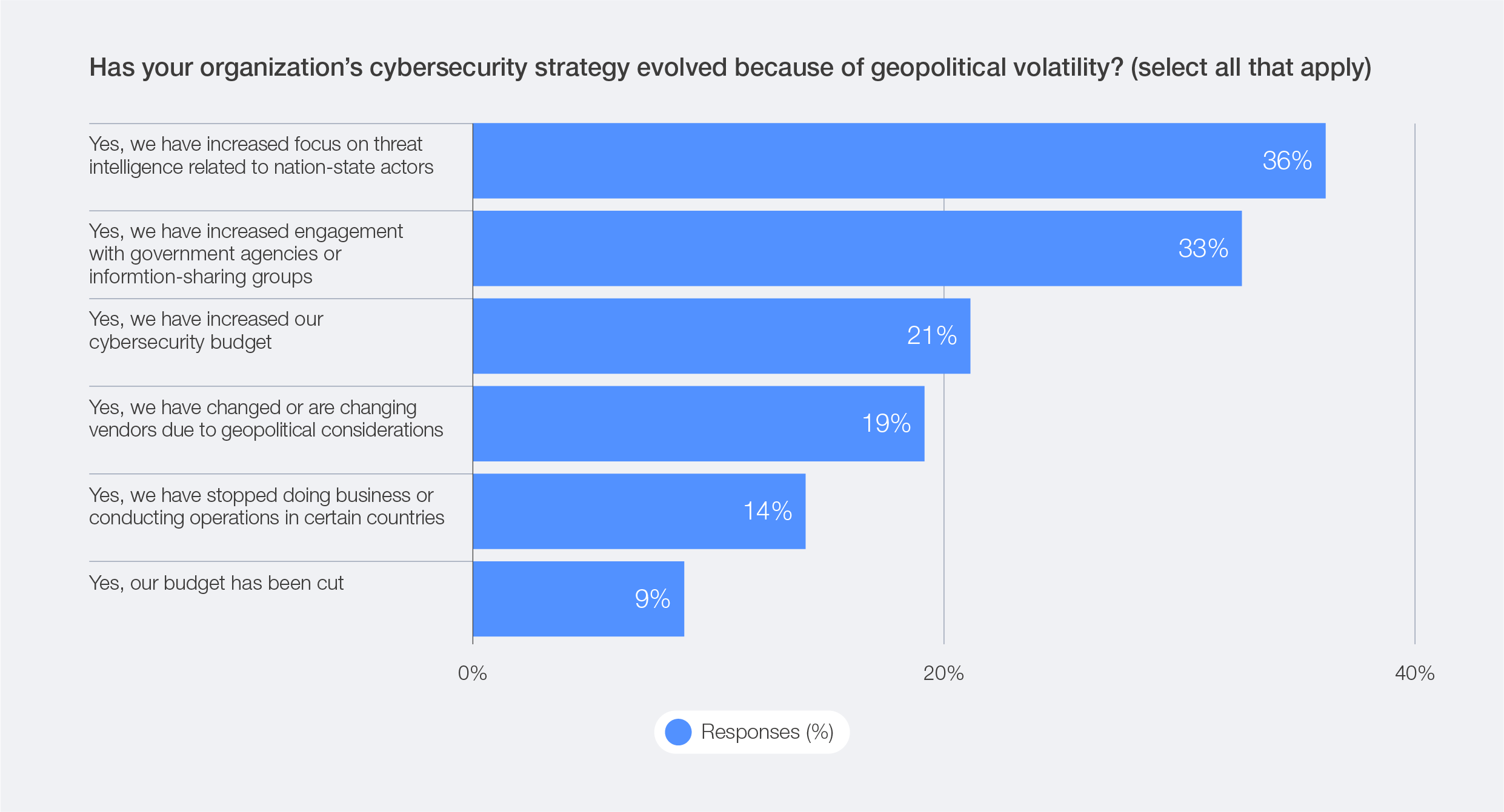 As state-sponsored attacks and espionage campaigns intensify, organizations face mounting challenges in forecasting cyber risks and aligning strategies with shifting global conditions. Participants in focus group interviews for this report warn that these pressures will persist, reinforcing the need for adaptive, resilient cyber strategies despite constrained budgets.