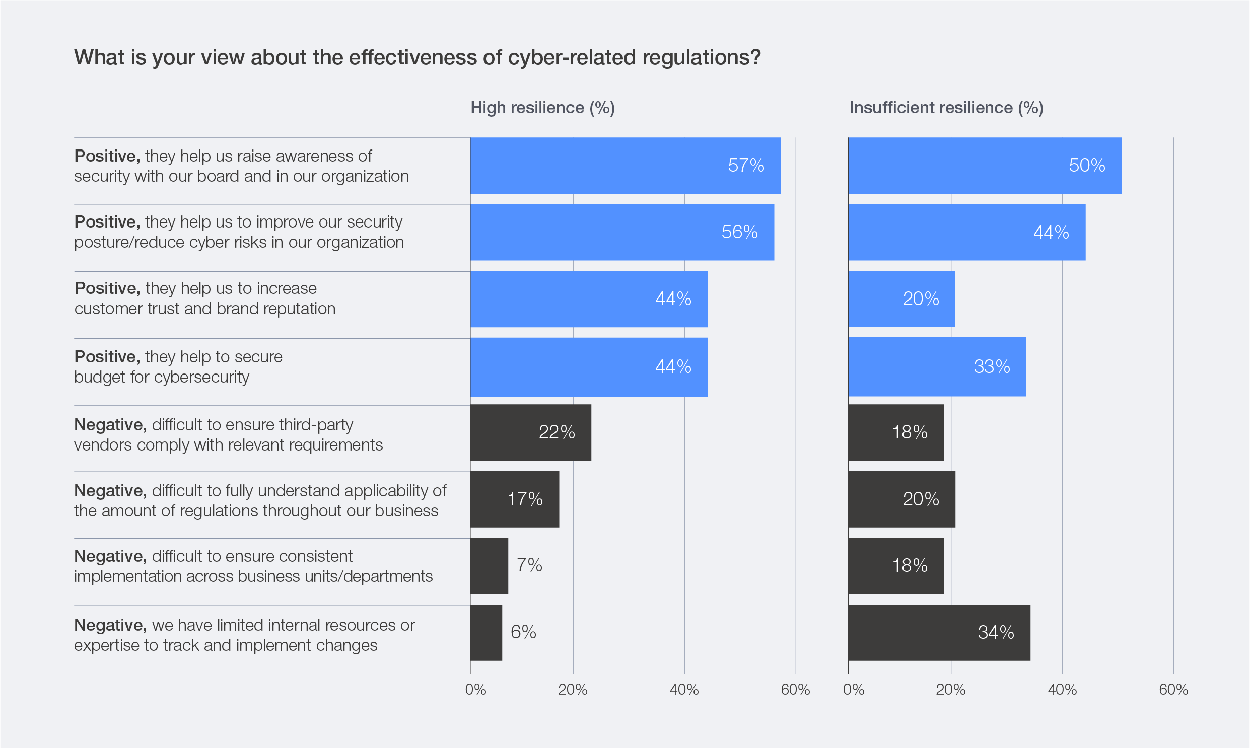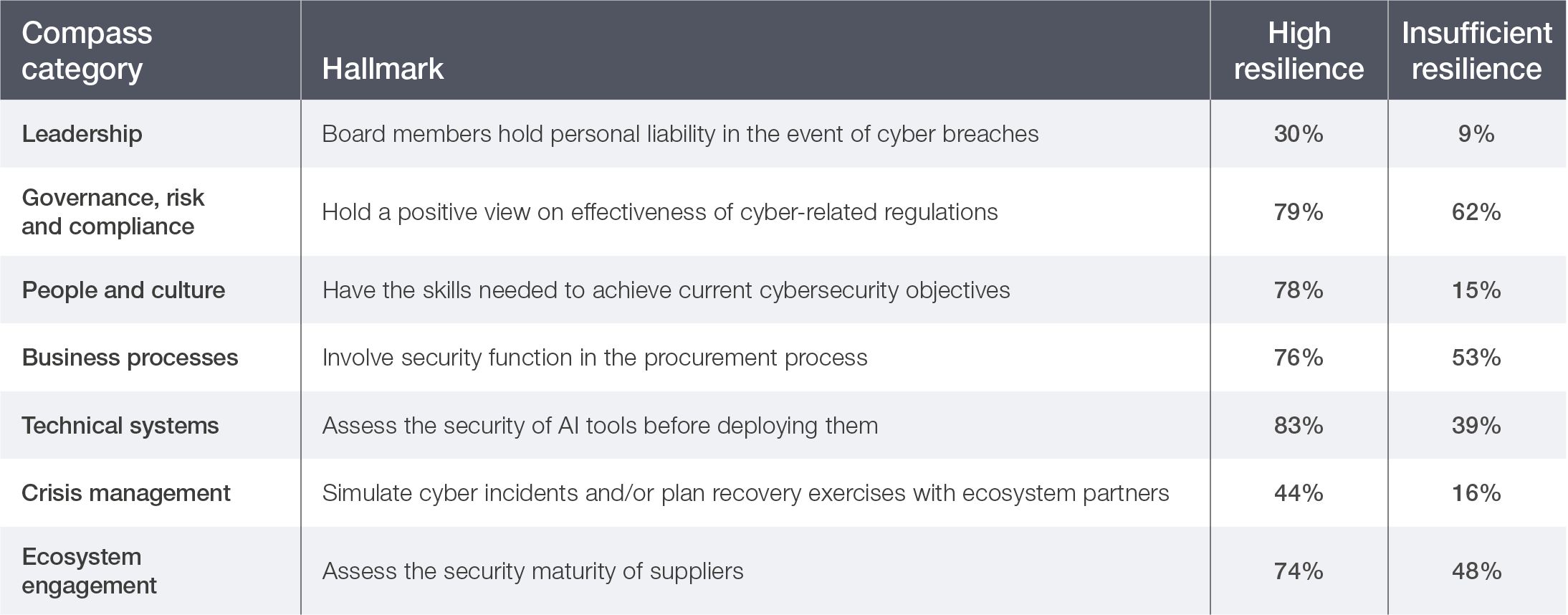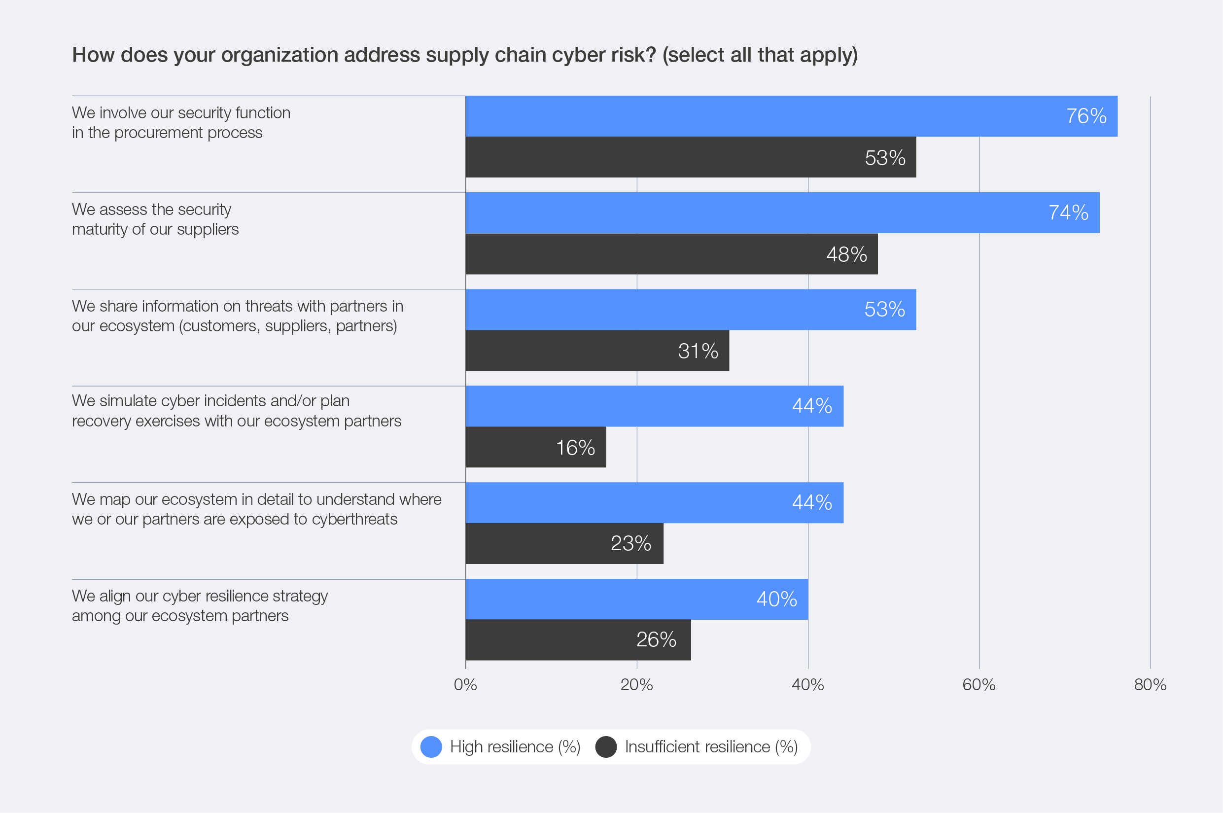 Highly resilient organizations are more proactive in engaging their entire ecosystem: 53% share cybersecurity information with partners (compared to 31% of insufficiently resilient organizations); 74% assess the security of their suppliers (versus 48%); and 44% map their ecosystem and evaluate partners’ exposure to risk (versus 23%).