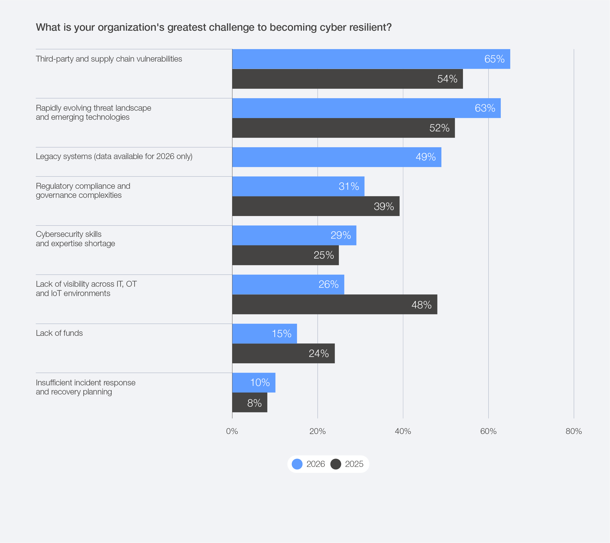 Concerns about the resilience of supply chains against cyberattacks are continuing to worry business and cyber executives. This year’s survey data shows that 65% of large companies by revenue indicate third-party and supply chain vulnerabilities are their greatest challenge, which has risen from 54% in 2025.42