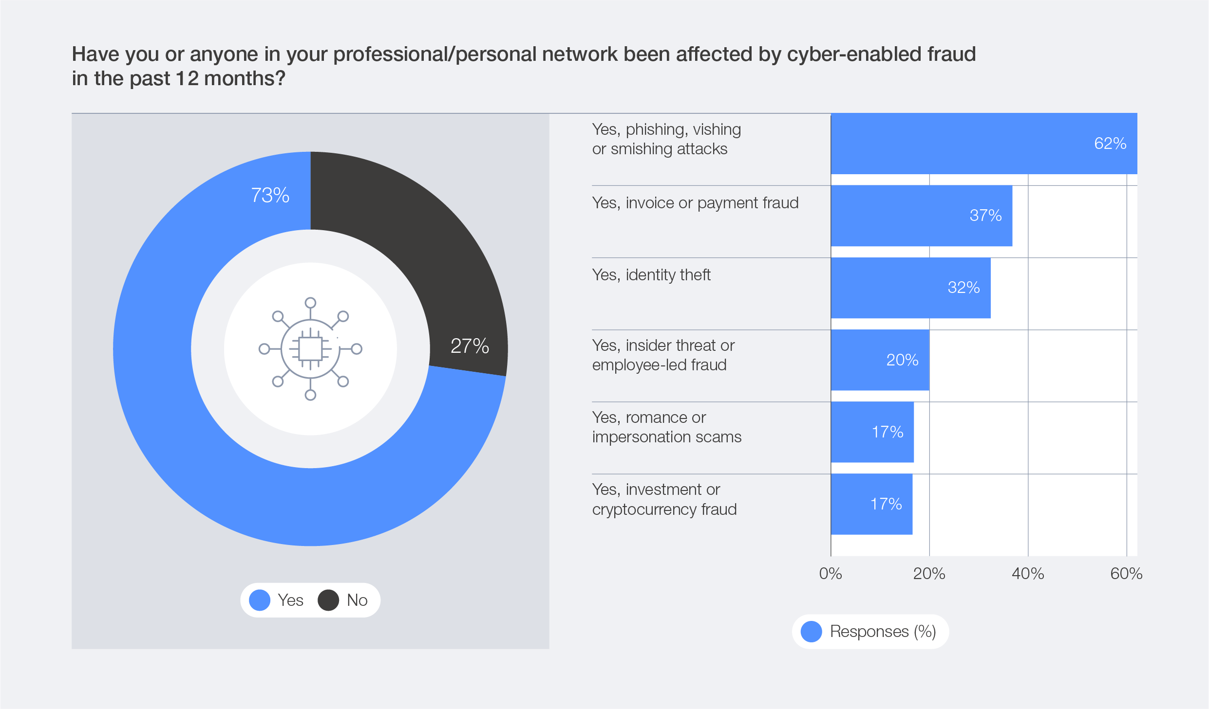 Cyber-enabled fraud continues to grow in scale, taking a heavy toll on individuals and organizations around the world. According to the Global Cybersecurity Outlook survey data, 77% of respondents reported an increase in cyber-enabled fraud and phishing overall, while 73% claimed that they or someone in their network had been personally affected by cyber-enabled fraud. The three most common types of attacks reported are phishing (including vishing and smishing), payment fraud and identity theft.