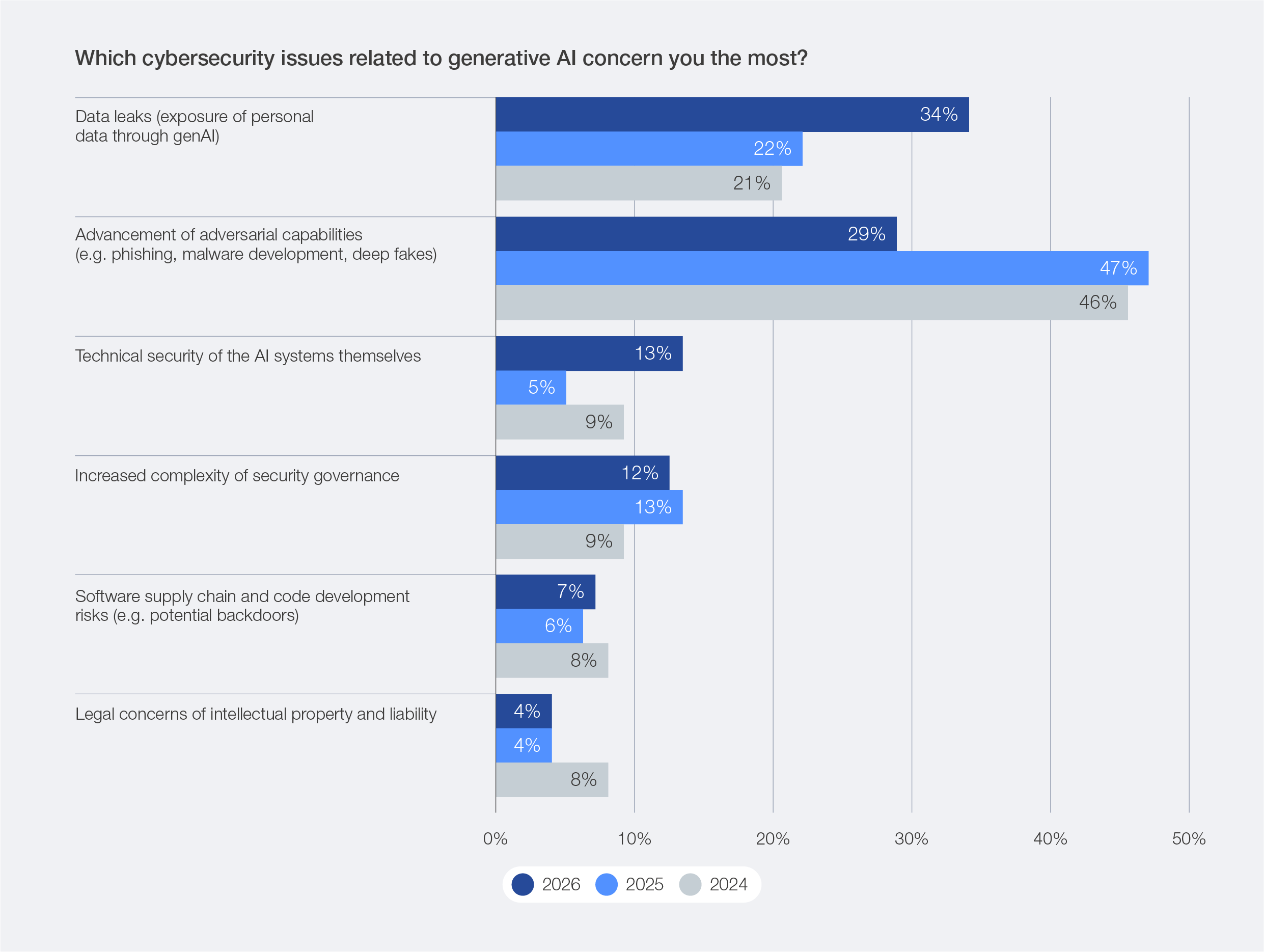 Data leaks associated with genAI (34%) and the advancement of adversarial capabilities (29%) stand out as leading concerns for 2026. This marks a striking reversal from previous years – in 2025, advancement of adversarial capabilities topped the list at 47% compared to only 22% for data leaks associated with genAI. The shift underscores a turning point in the AI risk landscape for the upcoming year: while the “AI arms race” between attackers and defenders continues to intensify, attention is pivoting from purely offensive innovation with AI towards the unintended exposure and misuse of sensitive data through generative and agentic systems.
