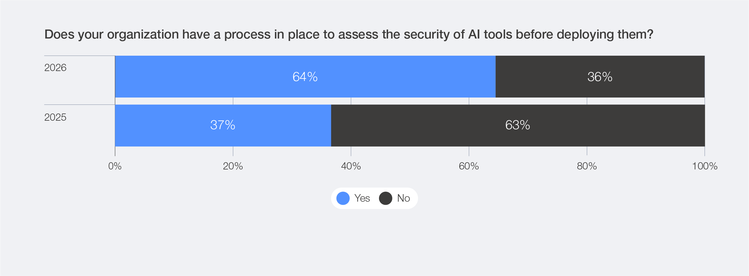 In the 2026 survey, 40% of organizations reported conducting periodic reviews of their AI tools before deploying them, rather than only doing a one-time assessment (24%) – a clear sign of progress towards continuous assurance. However, roughly one-third still lack any process to validate AI security before deployment, leaving systemic exposures even as the race to adopt AI in cyber defences accelerates.