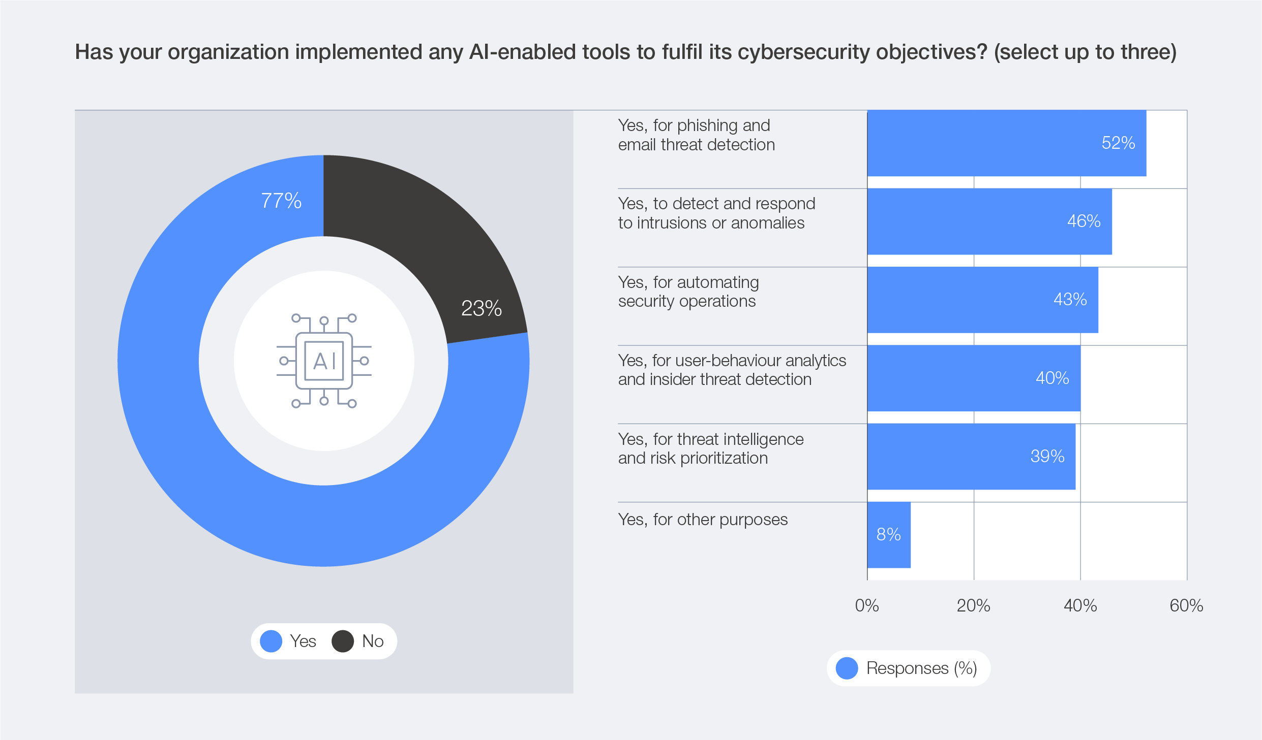 AI is fundamentally transforming security operations – accelerating detection, triage and response while automating labour-intensive tasks such as log analysis and compliance reporting. AI’s ability to process vast datasets and identify patterns at speed positions it as a competitive advantage for organizations seeking to stay ahead of increasingly sophisticated cyberthreats. The survey data reveals that 77% of organizations have adopted AI for cybersecurity, primarily to enhance phishing detection (52%), intrusion and anomaly response (46%) and user-behaviour analytics (40%).