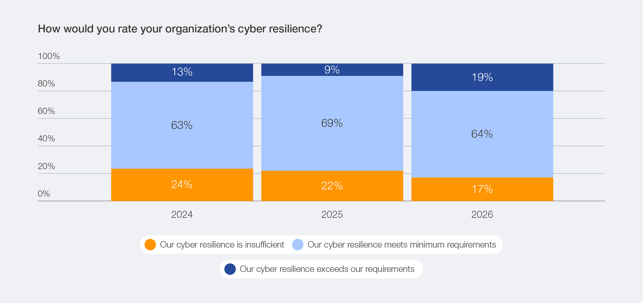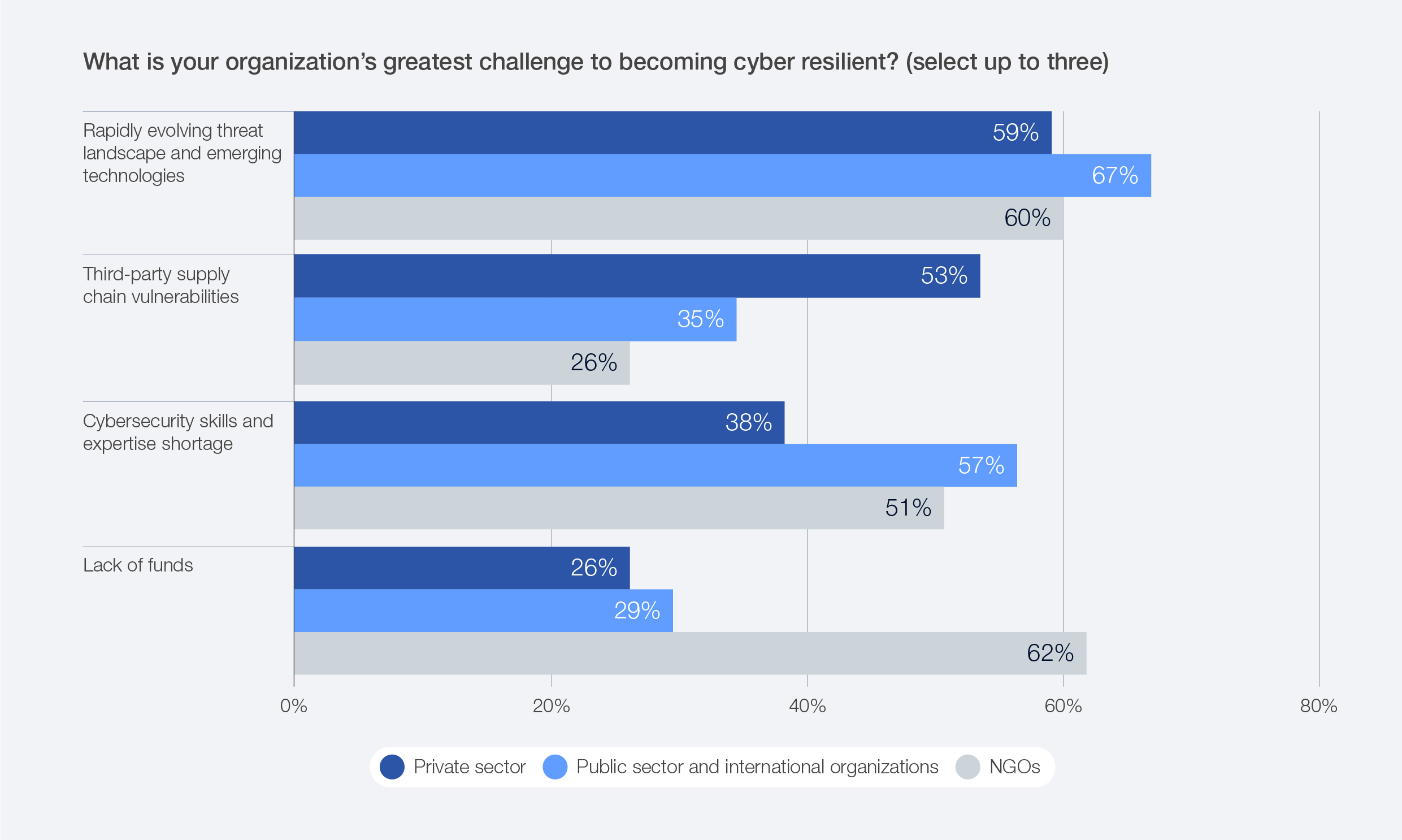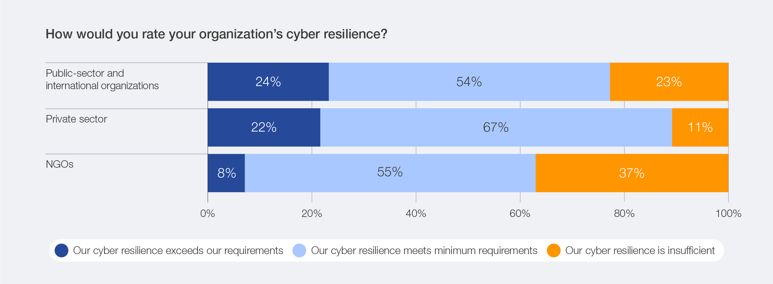 The 2026 survey data reveals that perceptions of resilience levels still vary across regions. High degrees of confidence in resilience levels are expressed by respondents based in the Middle East and North Africa, while lower levels of resilience are expressed in Latin America and the Caribbean and sub-Saharan Africa. Despite rising confidence in cyber resilience overall, inequities persist between smaller and larger organizations.47 Survey data indicates that small organizations (by revenue) are twice as likely to experience insufficient resilience levels as large organizations. Similarly, across sectors, survey data reveals that the divide remains: NGOs report 37% insufficient resilience, and the public sector 23%, compared with just 11% in the private sector.