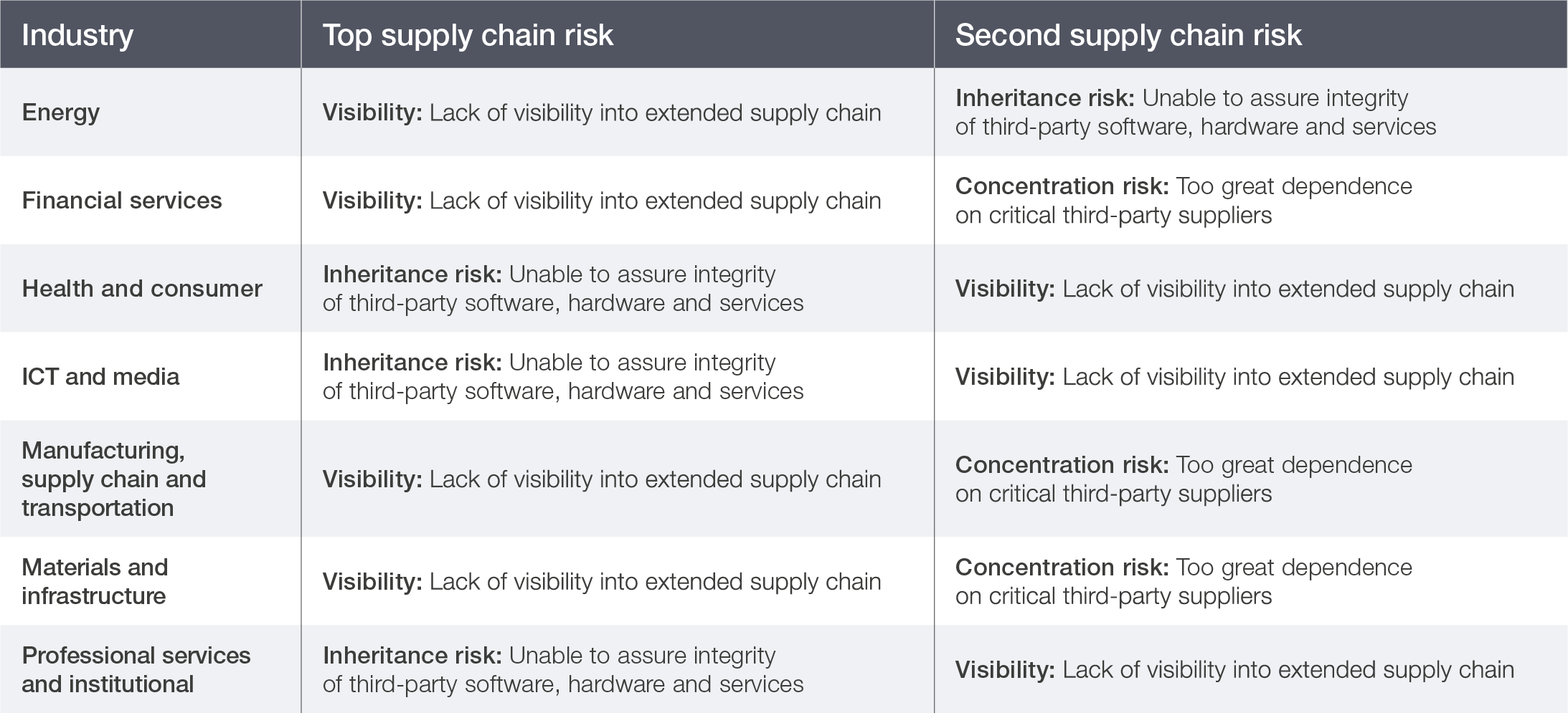 Supply chain risks differ across industries. Overall, limited visibility emerges as the primary risk across industry clusters – especially for energy; financial services; manufacturing, supply chain and transportation; and materials and infrastructure – followed by inheritance risk.