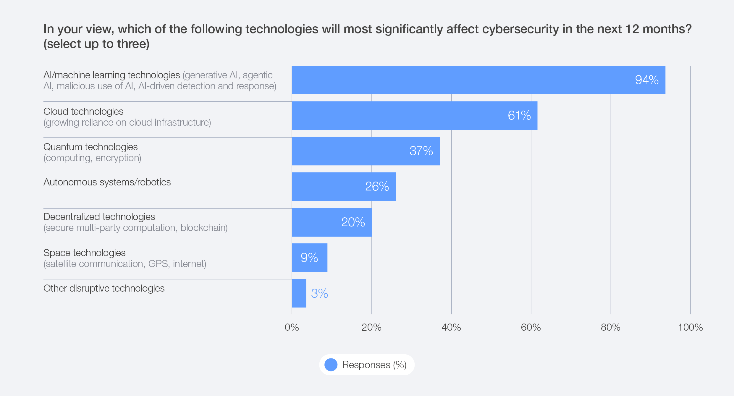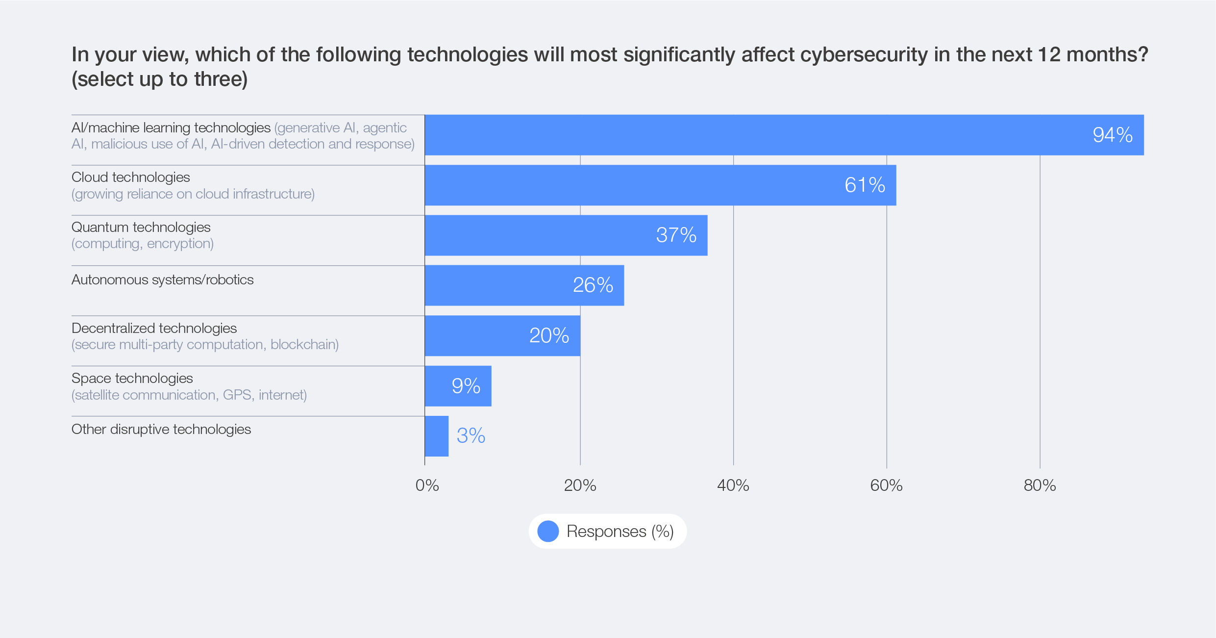 Space and seabed infrastructure remain comparatively overlooked in cyber risk planning, despite enabling core functions of critical infrastructure. In 2026, 9% of respondents indicated that space technologies will most significantly impact cybersecurity. Looking ahead to 2030, satellite-based positioning, navigation and timing will be even more essential for aviation, maritime activities, power-grid coordination and financial transactions. At the same time, satellite communications and undersea cables will form the backbone for emergency services, cloud infrastructure and international data exchange.54 Despite this, only 15% of respondents consider space assets, and 18% account for undersea cables, in cyber risk mitigation. With the growth of AI-driven operations, cloud services and autonomous systems, organizations will increasingly rely on precise timing, navigation and robust data connections. This heightened dependence means that even small disruptions in satellite or undersea cable infrastructure could trigger widespread impacts across entire digital ecosystems.