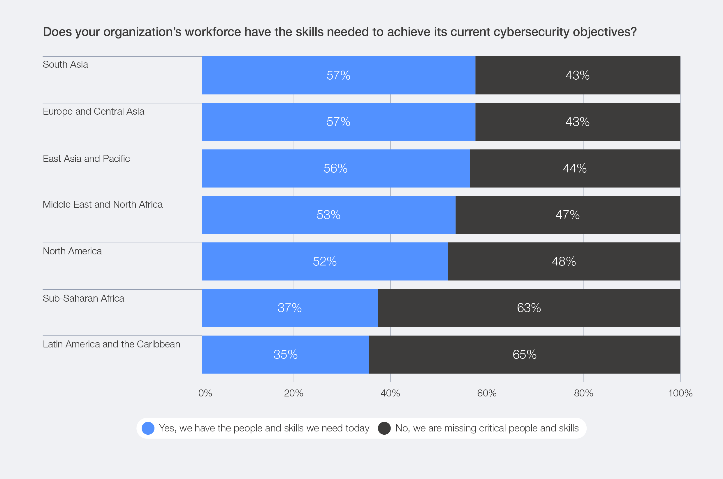 When viewed through a regional lens, cybersecurity talent shortages are most acute in Latin America and the Caribbean, where 65% of organizations reported lacking critical people and skills to meet cybersecurity objectives, and in sub-Saharan Africa (63%).