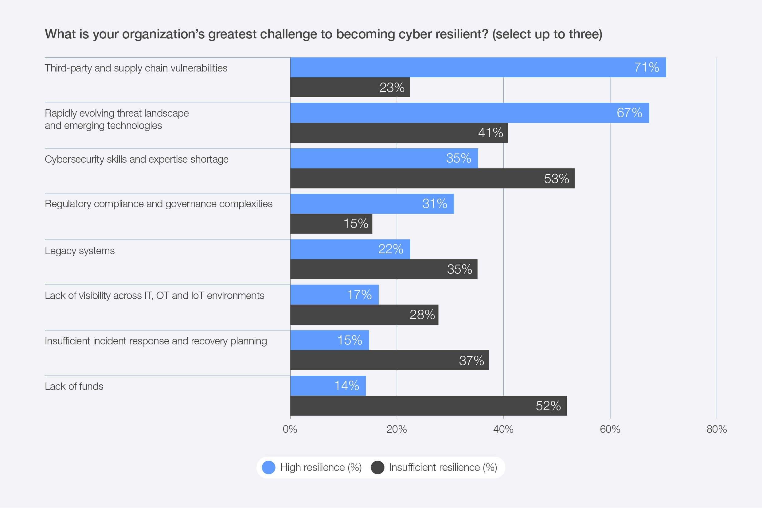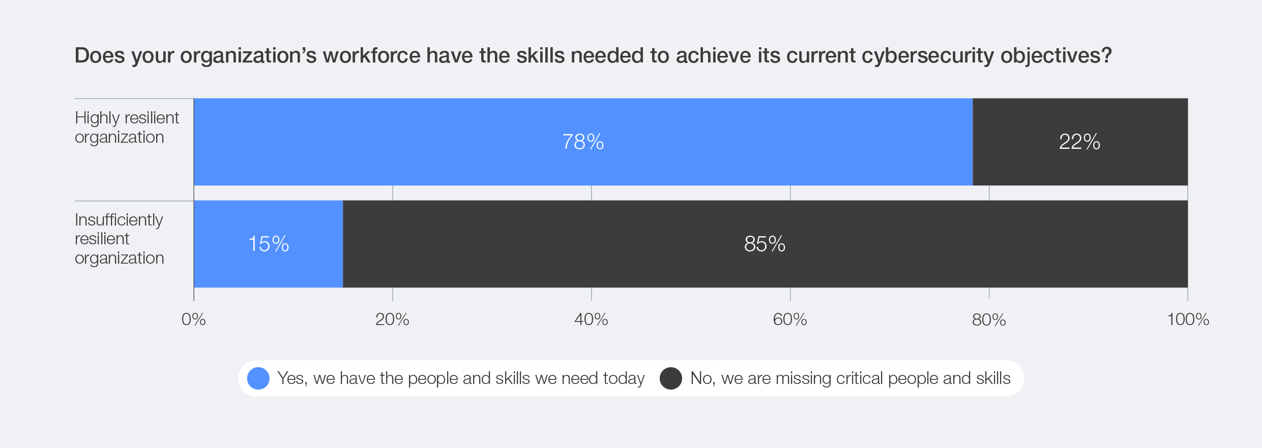 Having adequate cybersecurity skills has emerged as a key differentiator between highly resilient and insufficiently resilient organizations. Among those reporting insufficient levels of cyber resilience, 85% also cited missing critical skills and people to fulfil cybersecurity objectives. By comparison, only 22% of highly resilient organizations viewed skills gaps as a significant challenge. According to the survey, the top three cybersecurity roles experiencing shortages are threat intelligence analysts, DevSecOps engineers, and identity and access management specialists.