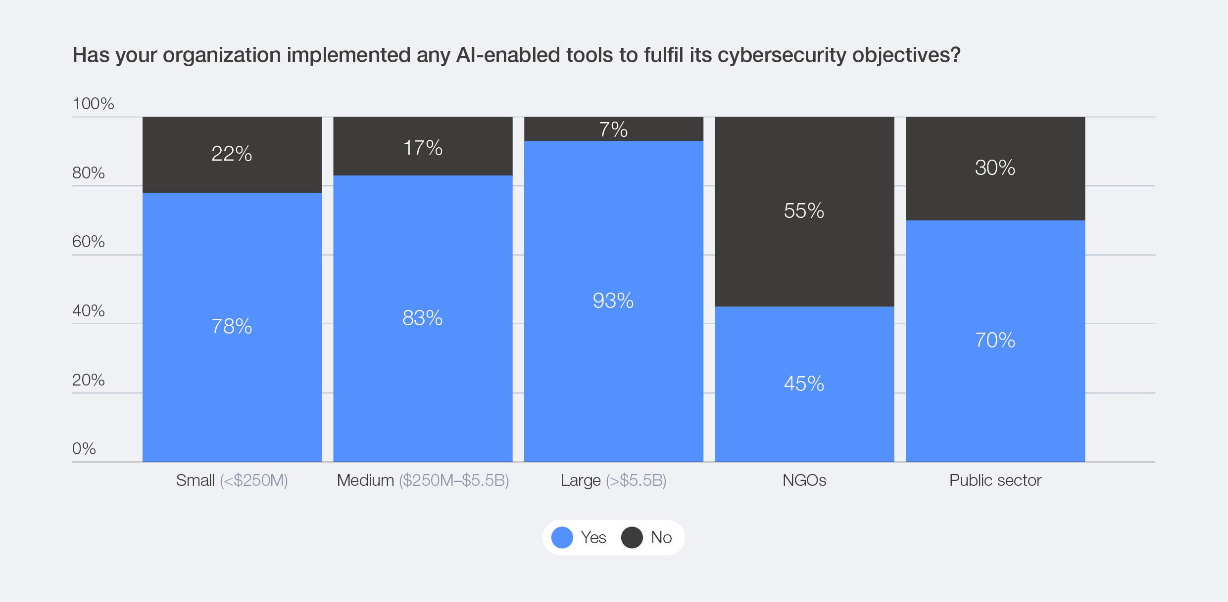 While the evolving threat landscape remains the foremost concern, the lack of cybersecurity expertise ranks as the second-most significant challenge – NGOs (51%) and the public sector (57%). When comparing small and large organizations, the data reveals a persistent divide: 46% of small organizations report a lack of cybersecurity skills and expertise, compared with 29% of large organizations.