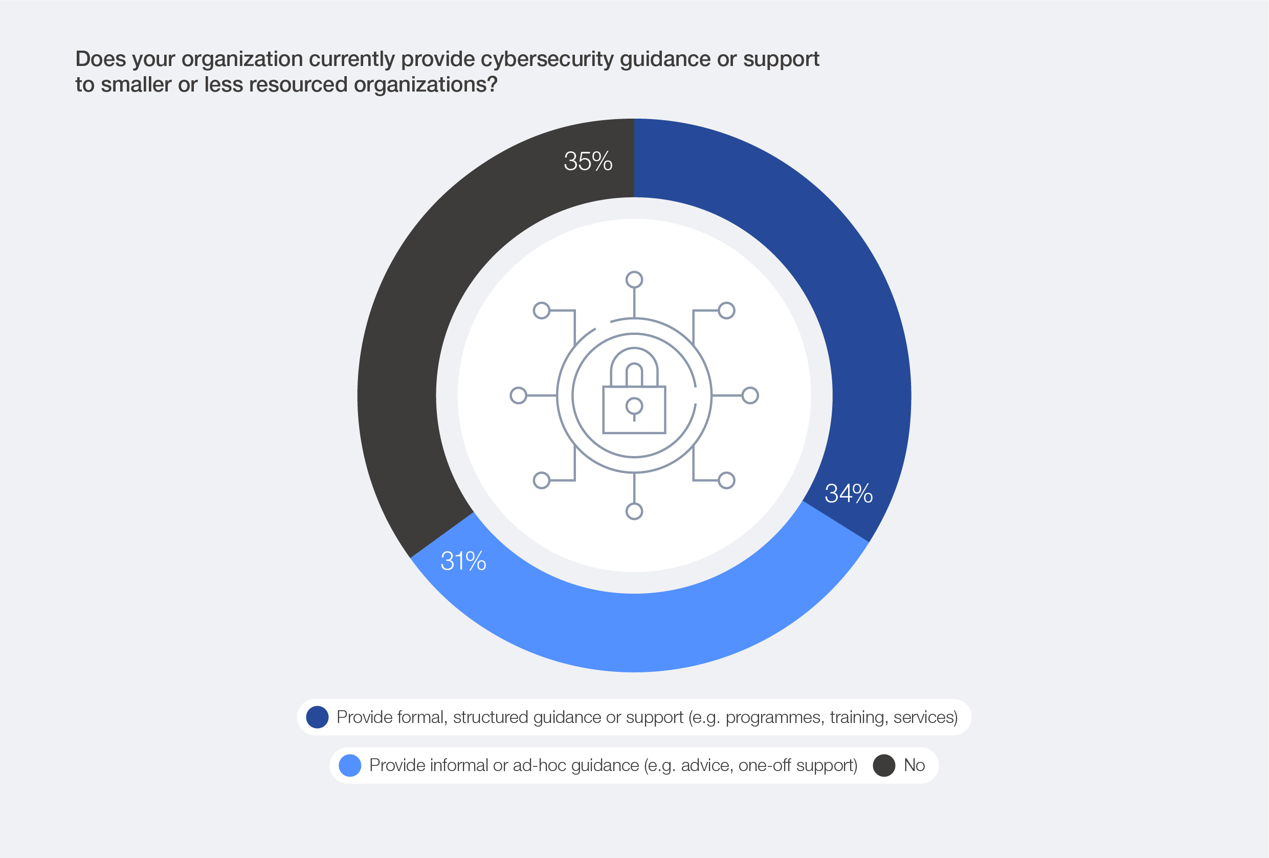 Encouragingly, some organizations acknowledge this imbalance and are taking steps to address it. Among experts surveyed during the Annual Meeting of the Global Future Councils and Cybersecurity 2025, 34% reported that their organizations provide formal, structured guidance or support – such as programmes, training or services – to smaller or less resourced partners. A further 31% said their organizations offer informal or ad hoc assistance.