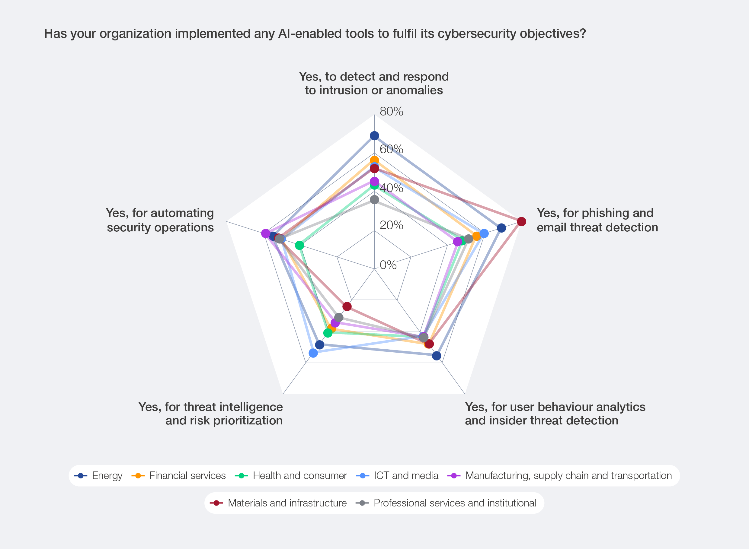 The adoption of AI tools to augment cybersecurity capabilities varies across industries, reflecting sectorspecific risk profiles and operational needs. The energy sector emphasizes intrusion and anomaly detection (according to 69% of respondents who have implemented AI for cybersecurity); the materials and infrastructure sector prioritizes phishing protection (80%); and the manufacturing, supply chain and transportation sector reports greater use of automated security operations (59%). These differences not only reflect sectoral risk profiles and operating constraints but also collectively point to a maturing portfolio of AI-enabled cyber defence capabilities that spans detection, intelligence, analytics and orchestrated cyber defence.