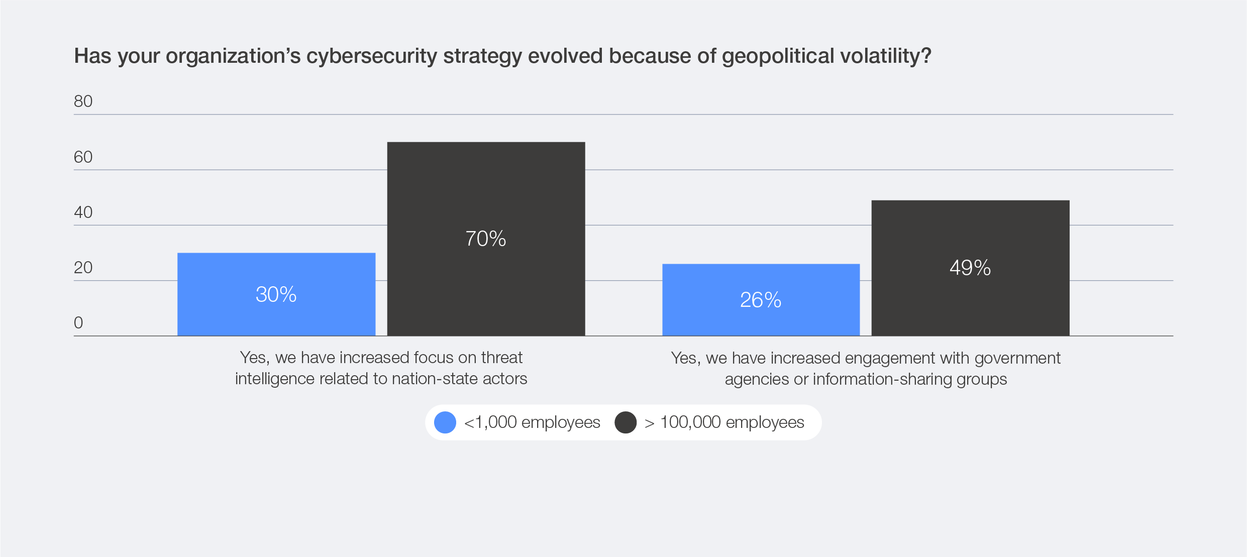 Data shows that 70% of the largest employers (those with more than 100,000 employees) have increased their focus on threat intelligence, compared to only 30% of small employers (those with 1,000 employees or fewer).7 Similarly, 49% of these large employers have deepened their engagement with government agencies or information-sharing groups, versus 26% of small employers. In contrast, those smaller organizations, with limited staff and narrower geographic footprints, appear to be less aware of direct geopolitical pressures and often have less capacity to participate in collective security efforts. This may mean relying more frequently on risk acceptance rather than active mitigation in response to geopolitical volatility.