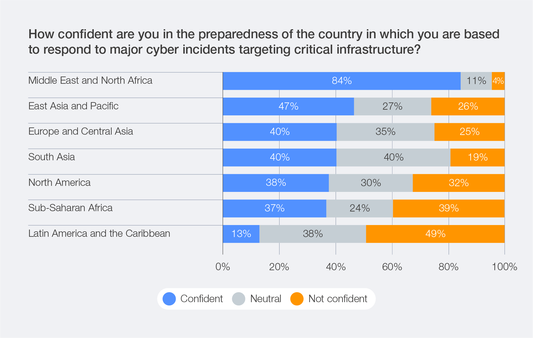In the context of geopolitical volatility, confidence in national cyber preparedness continues to erode, with 31% of survey respondents reporting low confidence in their nation’s ability to respond to major cyber incidents, up from 26% last year. Confidence levels vary greatly across regions. Respondents from the Middle East and North Africa express a high degree of confidence in their country’s ability to protect critical infrastructure (84%), while confidence is lower among respondents in Latin America and the Caribbean (13%).