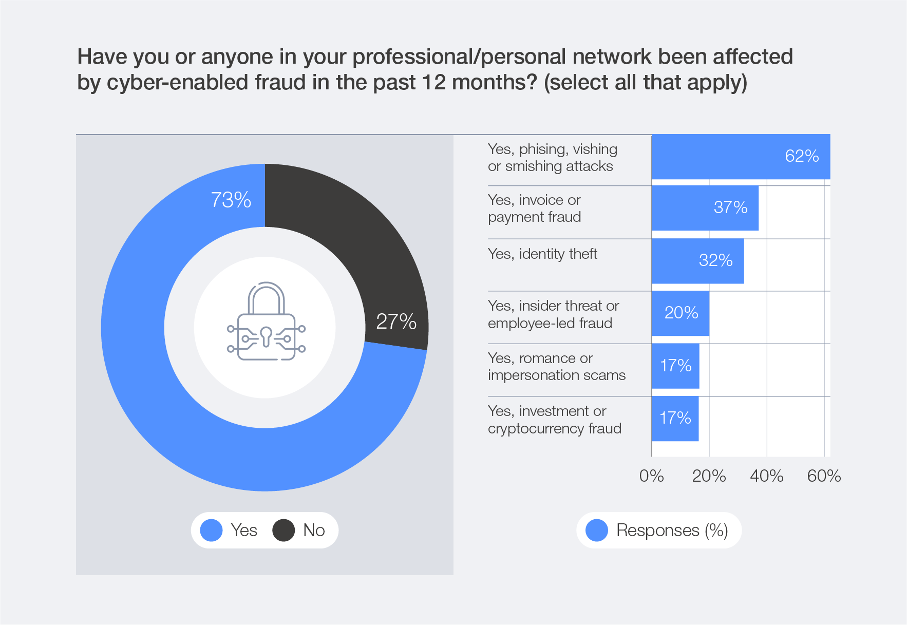 In the survey, 73% of respondents reported that they or someone in their network had been personally affected by cyber-enabled fraud over the course of 2025.