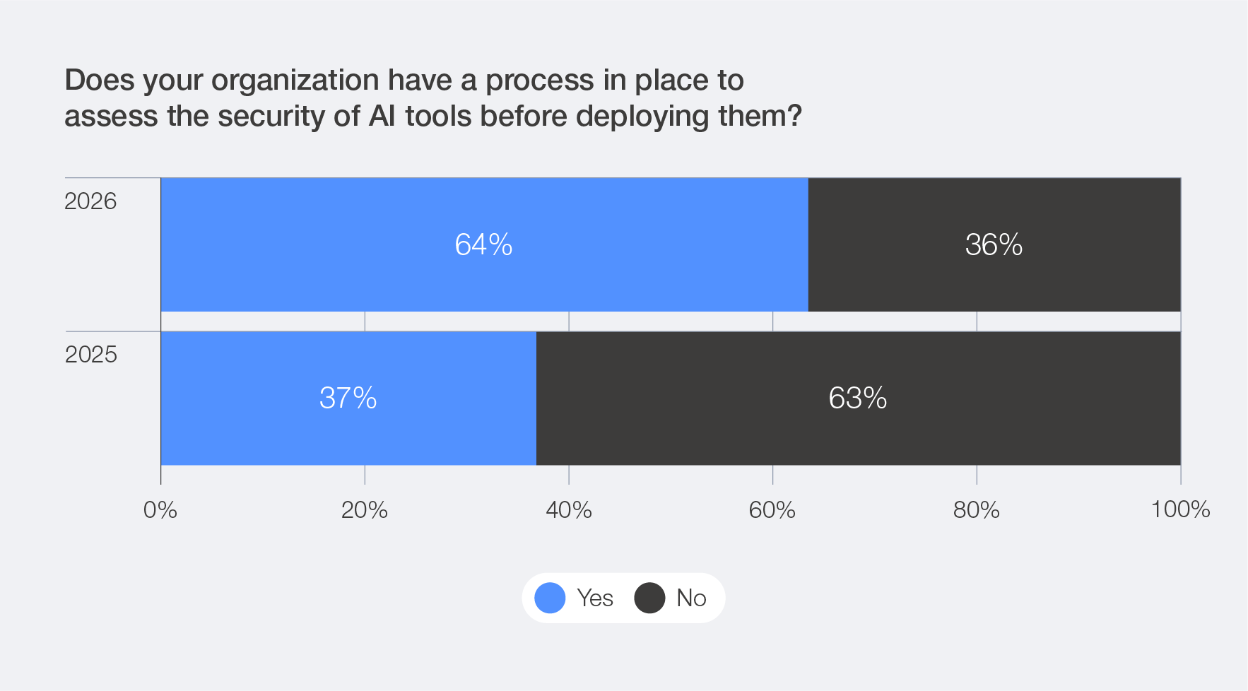 This growing recognition is translating into concrete action across organizations. The percentage of respondents assessing the security of AI tools has nearly doubled from the previous year, from 37% in 2025 to 64% in 2026.