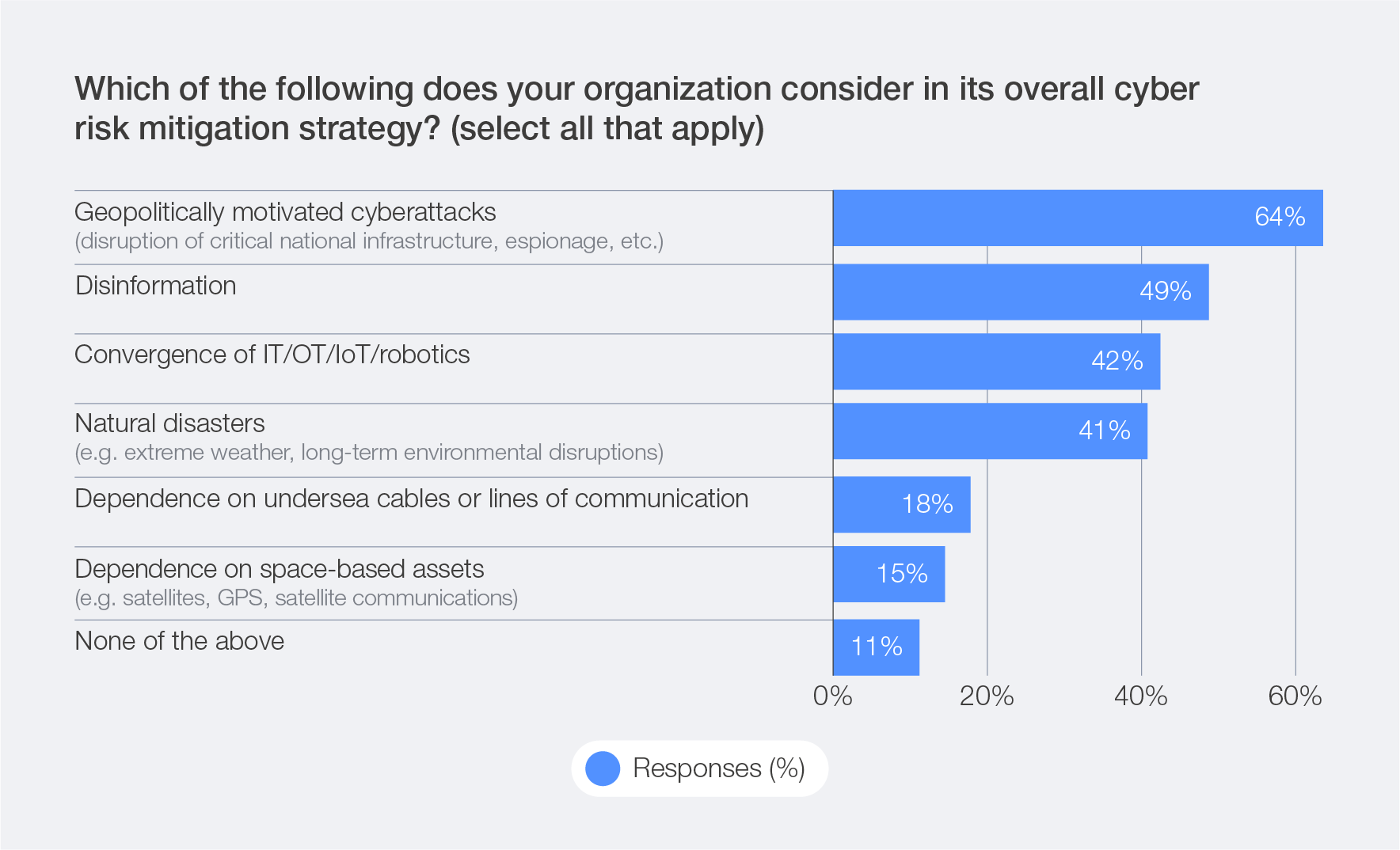 In 2026, geopolitics remains the top factor influencing overall cyber risk mitigation strategies. Some 64% of organizations are accounting for geopolitically motivated cyberattacks – such as disruption of critical infrastructure or espionage.
