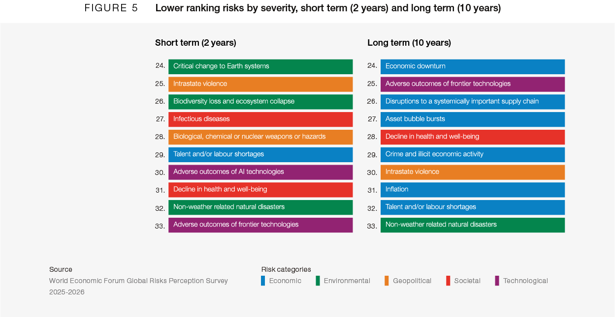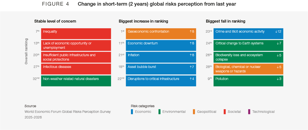 In a world already weakened by rising rivalries, unstable supply chains and prolonged conflicts at risk of regional spillover, such confrontation carries systemic, deliberate and far-reaching global consequences, increasing state fragility. The centrality of Geoeconomic confrontation in the global risks landscape is not restricted to 2026, with respondents selecting it as the top risk over the two-year time horizon (to 2028, Figure 3), as well, up eight positions from last year (Figure D).