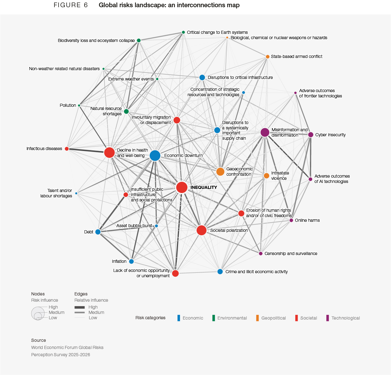 Rising societal and political polarization is intensifying pressures on democratic systems, as extremist social, cultural and political movements challenge institutional resilience and public trust. The growing prevalence of “streets versus elites” narratives reflect deepening disillusionment with traditional governance structures, leaving many citizens feeling excluded from political decision-making processes and increasingly skeptical that policy-making can deliver tangible improvements to livelihoods. Inequality was selected by respondents as the most interconnected global risk for a second year running, followed closely by Economic downturn (Figure 6).