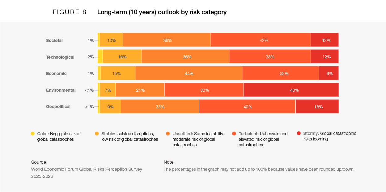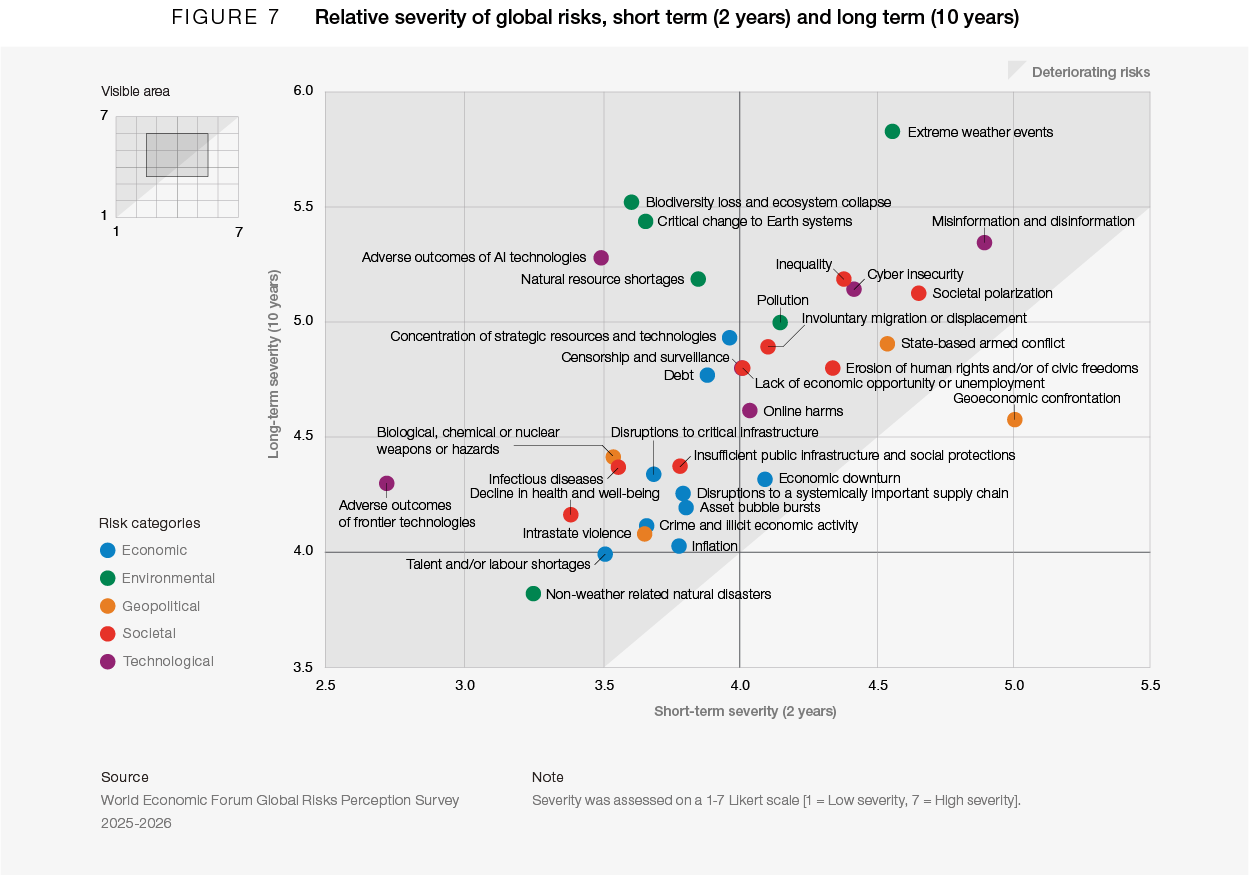 The Global Risks Report 2026, the 21st edition of this annual report, marks the second half of a turbulent decade. The report analyses global risks through three timeframes to support decision-makers in balancing current crises and longer-term priorities. Chapter 1 presents the findings of this year’s Global Risks Perception Survey (GRPS), which captures insights from over 1,300 experts worldwide. It explores risks in the current or immediate term (in 2026), the short-to-medium term (to 2028) and in the long term (to 2036). Chapter 2 explores the range of implications of these risks and their interconnections, through six in-depth analyses of selected themes. Below are the key findings of the report, in which we compare the risk outlooks across the three-time horizons.