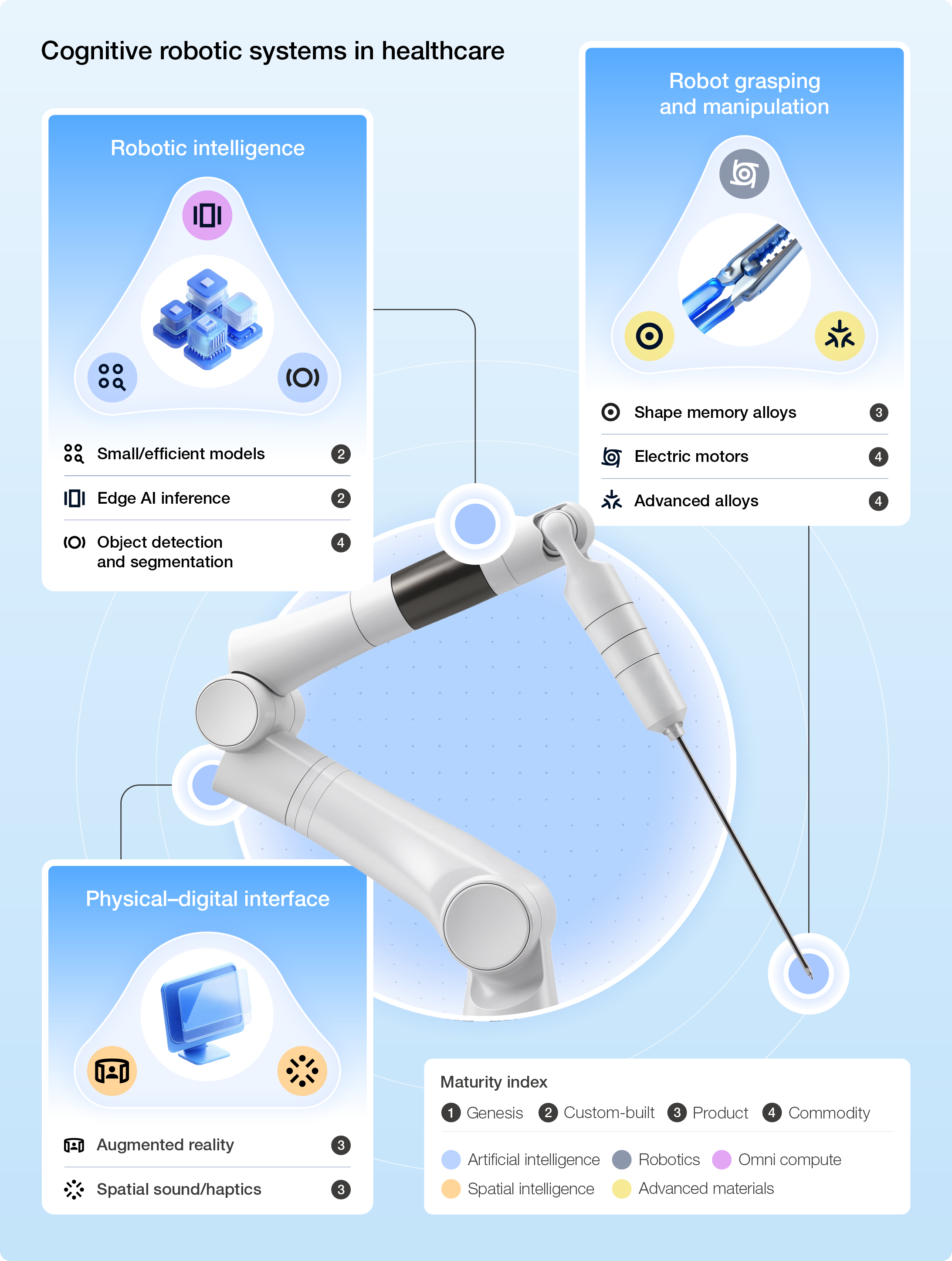 The figure shows how technologies from diverse domains and maturity levels combine to create surgical robots