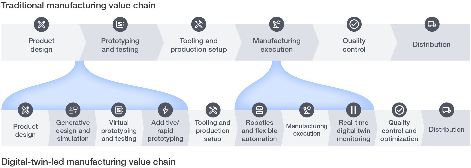 The figure shows how digital twins transform the traditional manufacturing value chain.