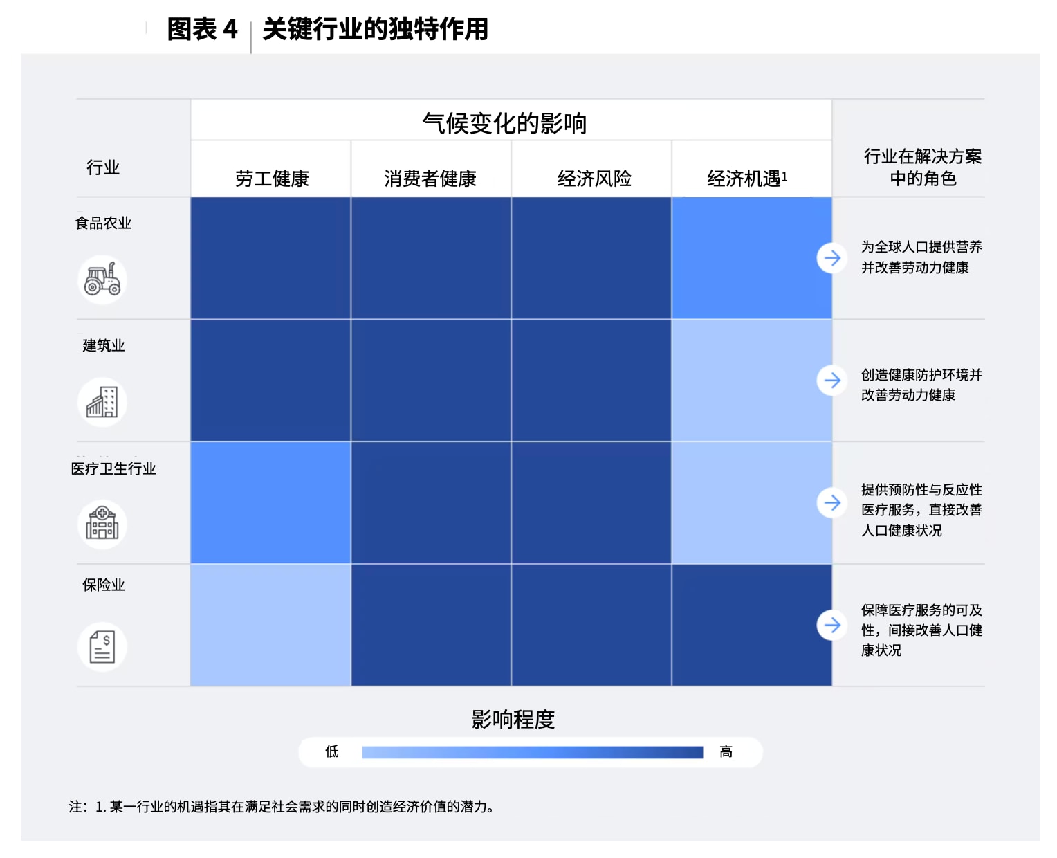 《构建应对气候变化对健康影响的经济韧性》报告深入剖析了食品农业、建筑业、医疗卫生和保险业四大行业中气候驱动的健康风险。报告探讨了各行业如何保障劳动者健康、提升运营韧性、扩大创新规模以应对气候变化影响。