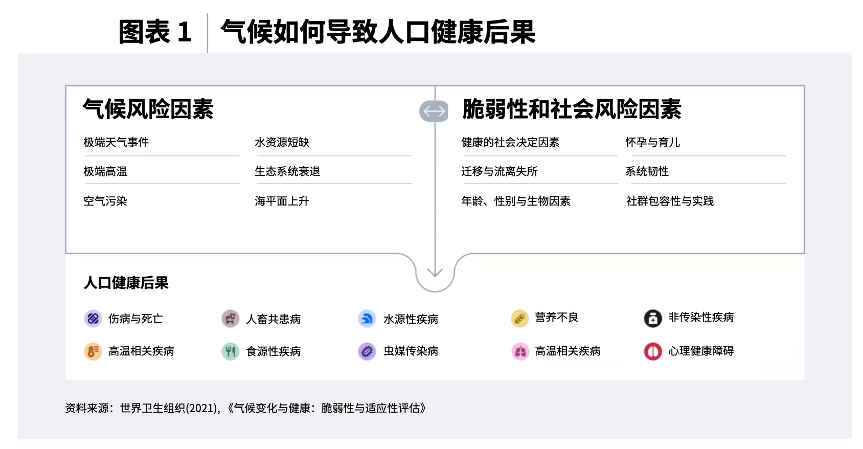 极端天气、水资源短缺、极端高温和空气污染等气候风险因素,以及它们对生态系统衰退和海平面上升的影响,都对人类健康产生重大影响。