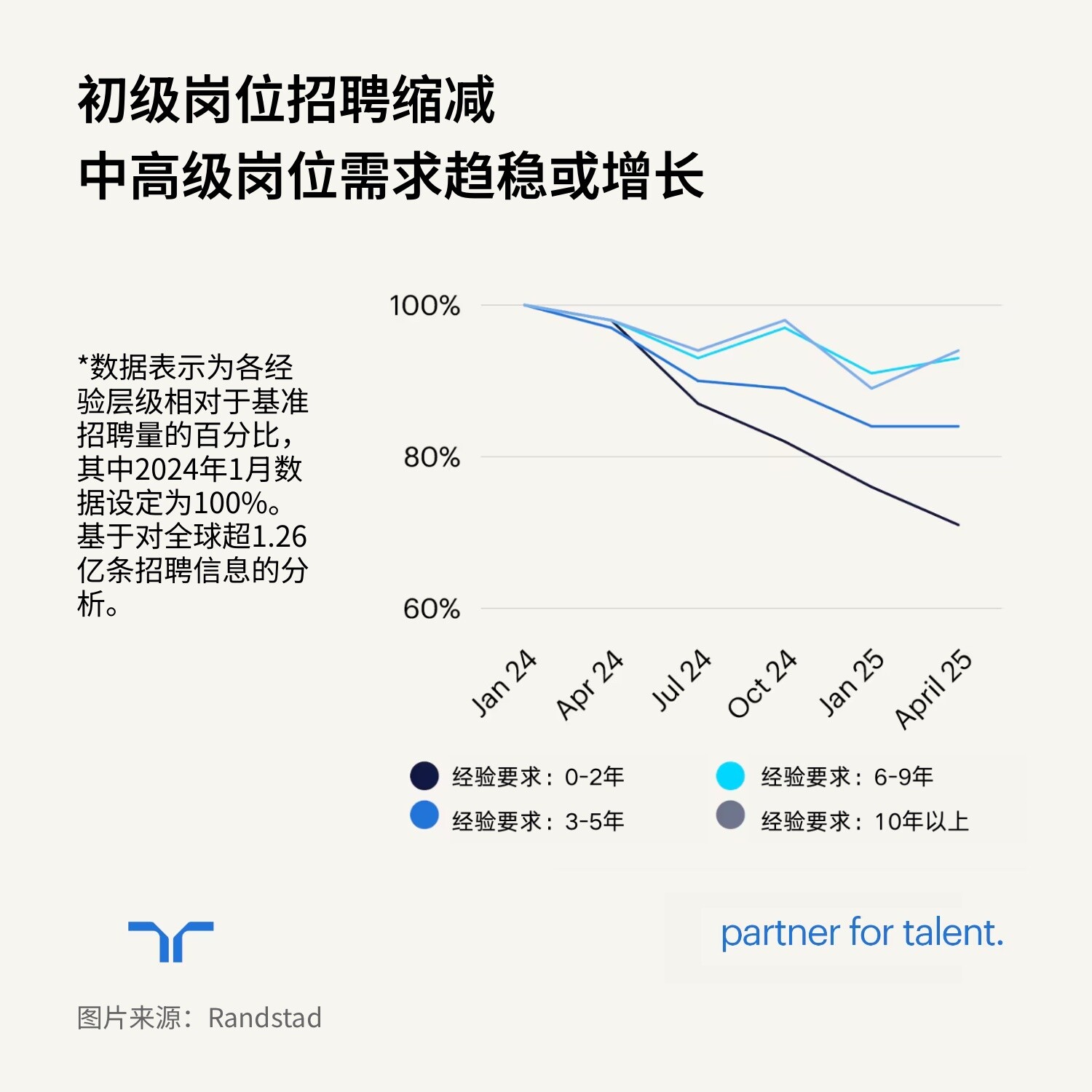 - 自2024年1月以来,全球初级职位招聘量已下滑29个百分点。