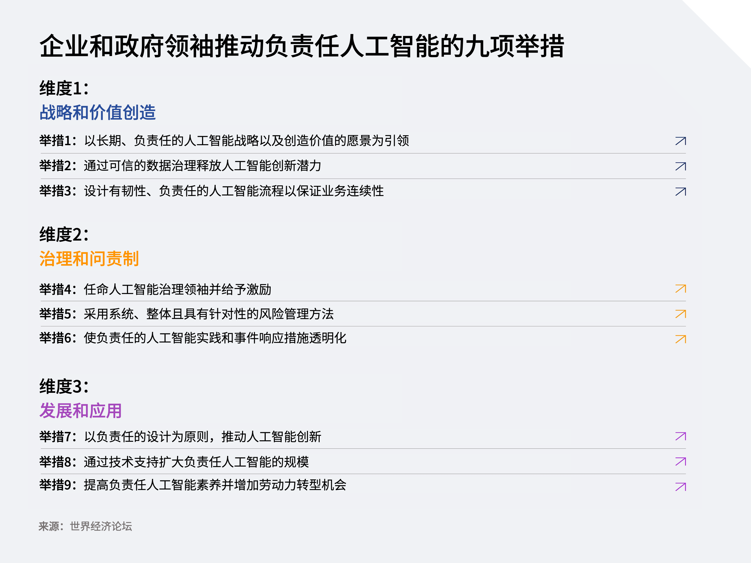 这一开创性的手册从三个维度提出了九项关键举措,帮助企业将理论原则付诸实践。同时,手册也强调了政府领袖在构建以公私合作伙伴关系和国际合作为基础的强大生态系统中的作用。