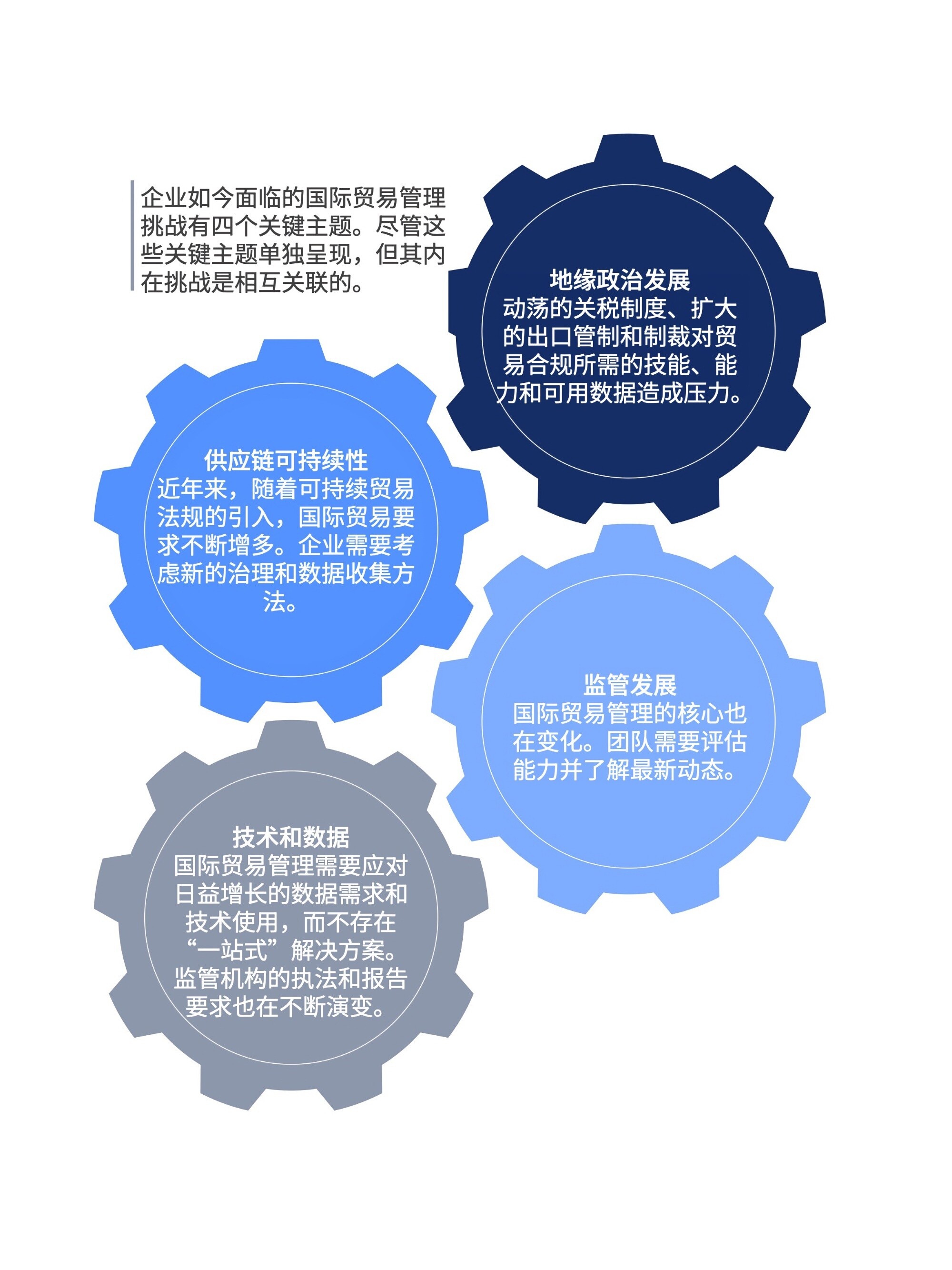 在地缘政治变化、不断发展的监管框架以及快速的技术变革的推动下,全球贸易格局正在经历根本性转变。因此,企业在国际贸易管理方面面临日益增加的复杂性和风险。这些变化的规模和潜在影响巨大,因为这些变化使数千亿美元的贸易流面临不符合新合规要求的风险。