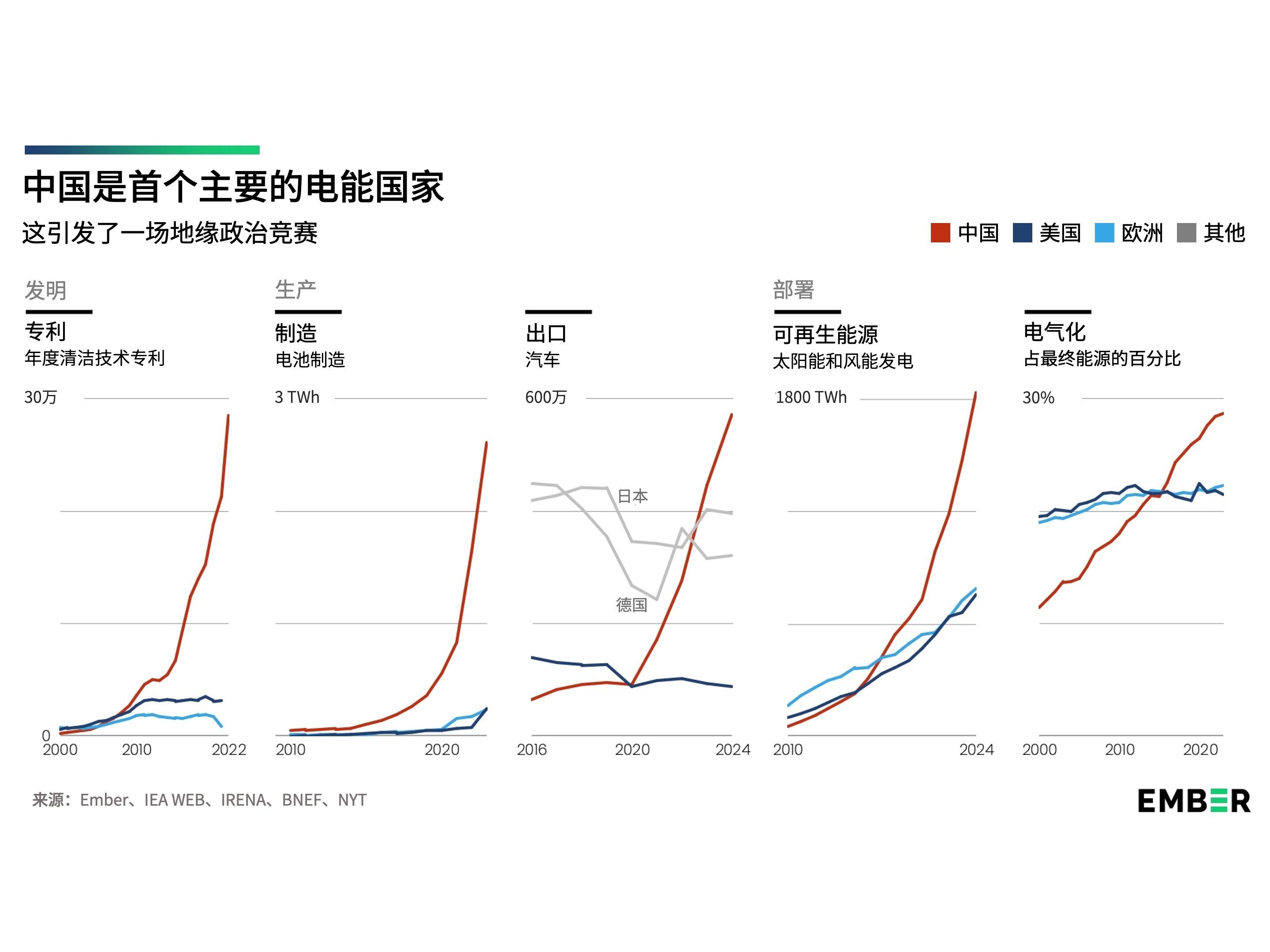 太阳能和风能正成为电力供应的主导力量。电动汽车、热泵和人工智能(AI)正在推动新的领域走向电气化。电池和数字化正使曾经波动的供给变得稳定,使曾经停滞的需求变得灵活。这三大转变共同构成了电能科技革命。中国已在这一电能科技革命中占据领先地位,包括美国和欧洲在内的其他地区必须迅速行动,认识到这一能源新时代的全部优势。