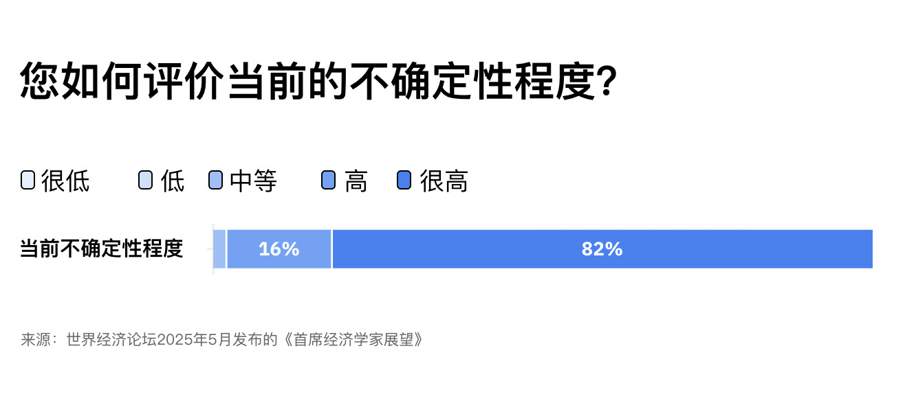 世界经济论坛发布的《首席经济学家展望》定期对各行业的首席经济学家进行调查,以评估他们对全球经济不确定性的感知程度。在2025年5月发布的报告中,82%的首席经济学家表示,当前的不确定性水平非常高。经济学家们指出,这可能会对贸易量、GDP增长和外国直接投资水平产生不利影响。
