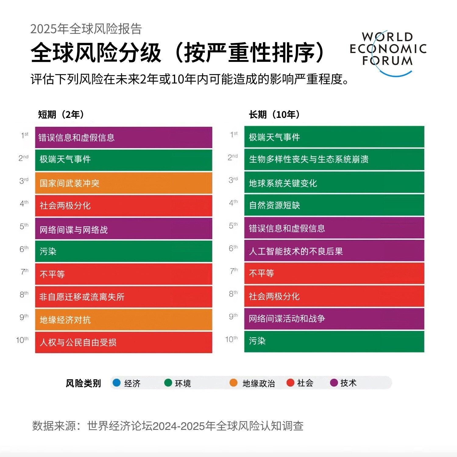 根据世界经济论坛发布的《2025年全球风险报告》,错误信息与虚假信息已被列为未来两年全球面临的最严峻风险。