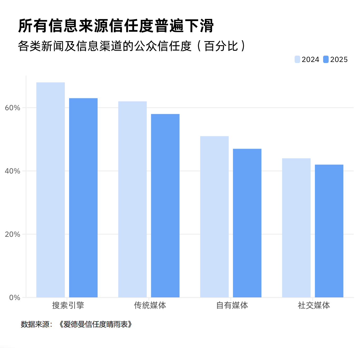 可与此同时,无论传统媒体、社交媒体、搜索引擎还是自有媒体,人们对所有信息源的信任都在流失。