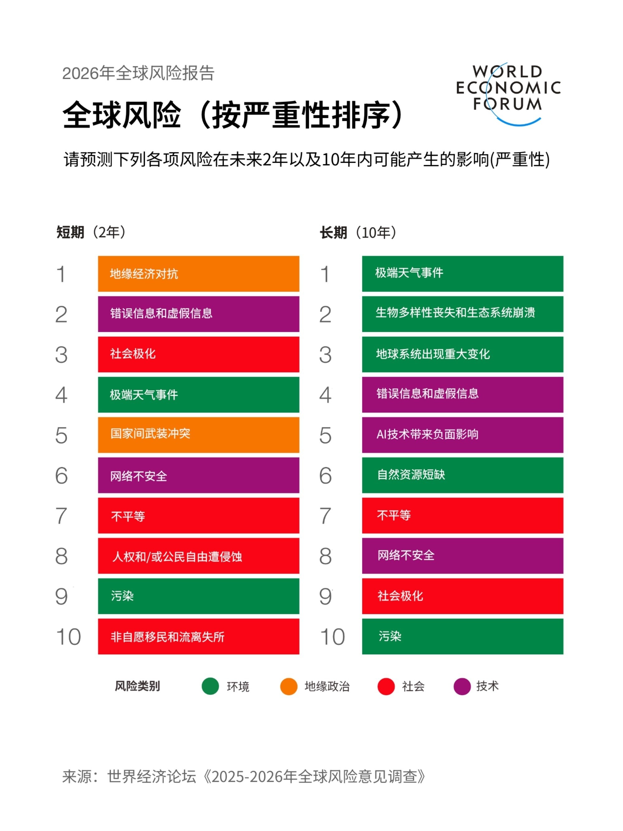 根据世界经济论坛的《2026年全球风险报告》,虽然在短期内我们面临的最严重风险来自地缘政治和经济领域,但从长期来看,环境风险,如生物多样性丧失和生态系统崩溃,才是最严峻的威胁。