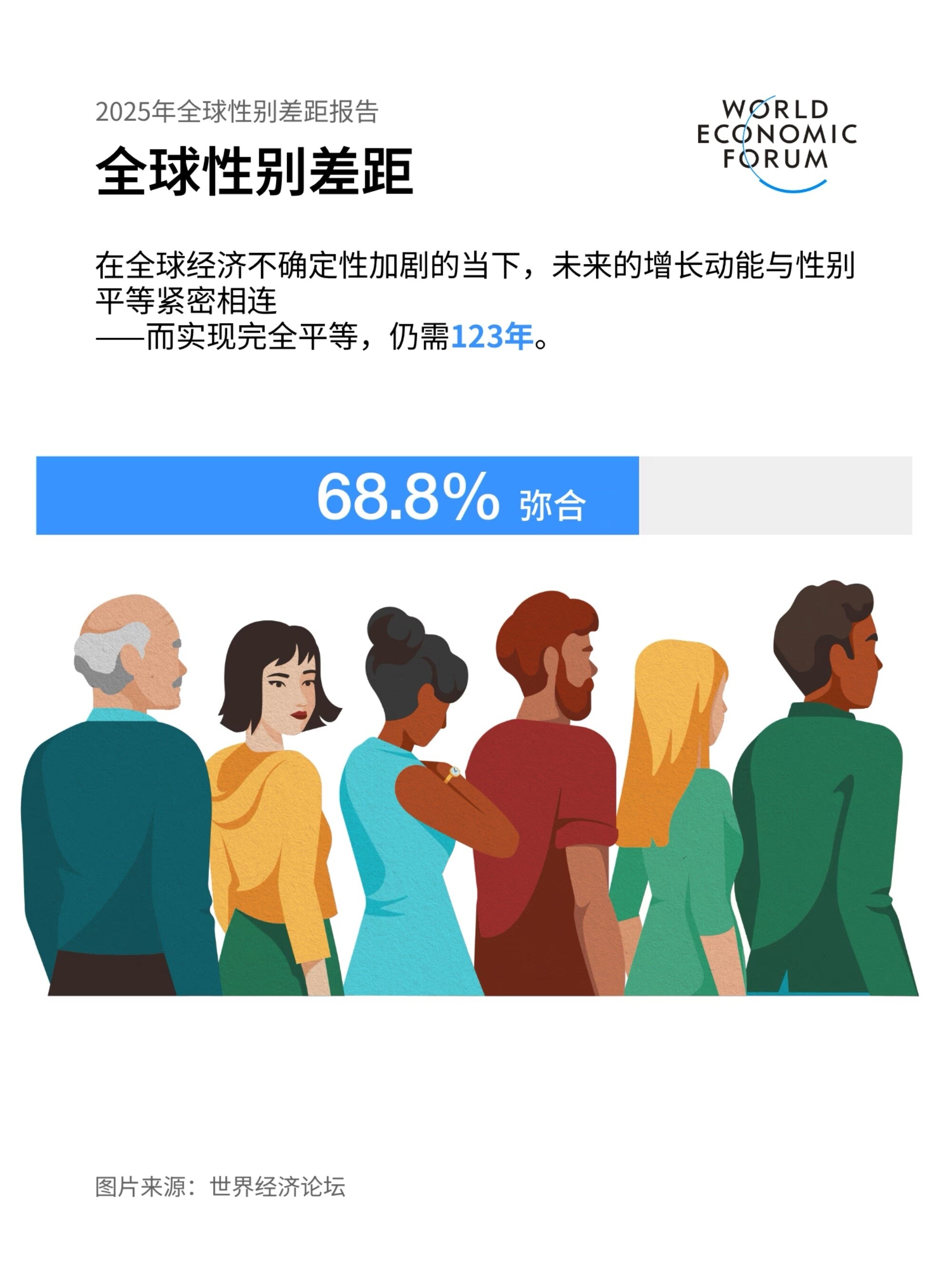 世界经济论坛最新发布的《2025年全球性别差距报告》显示,全球性别差距已缩小了 68.8%。但如果以自2006年起就纳入报告的100个经济体为观察样本,按照目前的速度,我们距离实现完全的性别平等仍有123年的路要走。