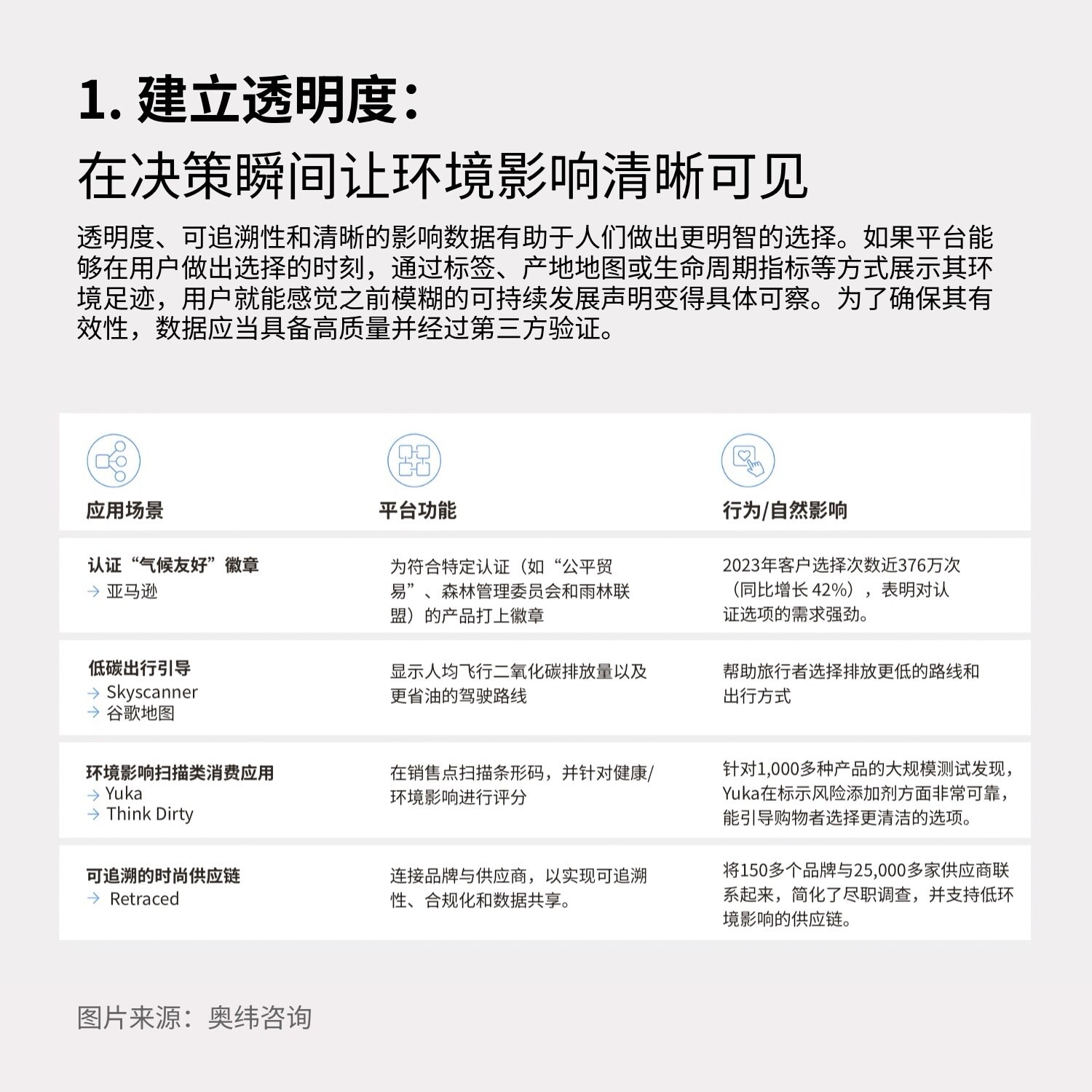 透明度、可追溯性和清晰的影响数据有助于人们做出更明智的选择。如果平台能够在用户做出选择的时刻,通过标签、产地地图或生命周期指标等方式展示其环境足迹,用户就能感觉之前模糊的可持续发展声明变得具体可察。为了确保其有效性,数据应当具备高质量并经过第三方验证。