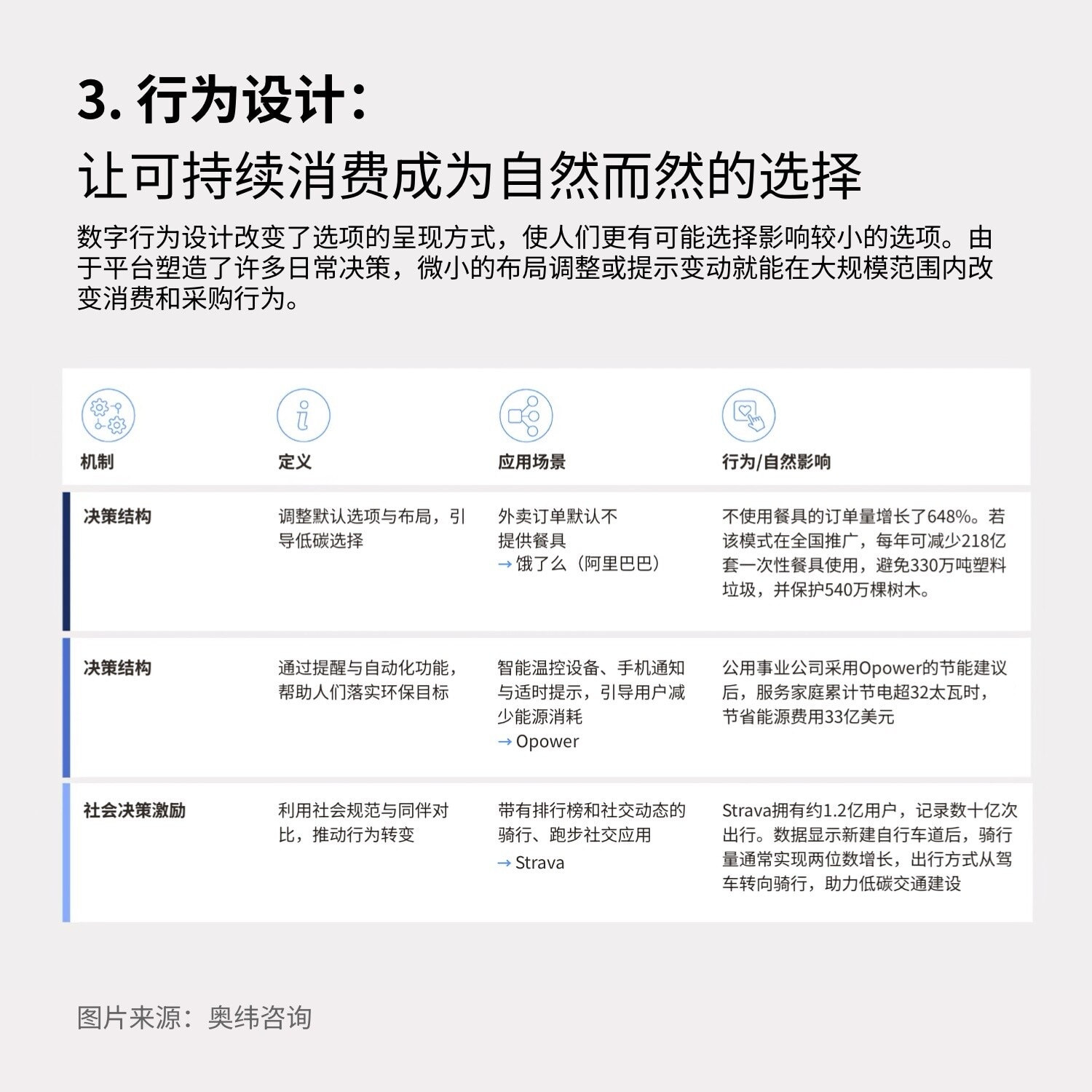 决策结构:改变默认设置和布局,以鼓励用户优先选择影响较小的选项。例如,阿里巴巴旗下的饿了么外卖平台将“无需餐具”设为默认选项,这使得无餐具订单增长了648%。决策辅助:提供提醒和自动化功能,帮助人们贯彻并实现其目标。例如,Opower公司通过智能温控器和提示,帮助其客户节省了超过32太瓦时的电力。社会决策诉求:利用社会规范和同伴比较来激励行为转变。社交骑行与跑步应用 Strava 的数据统计显示,在其应用记录的新自行车道上,骑行人数通常会出现两位数的增长,因为原本开车的用户会转为骑车出行。