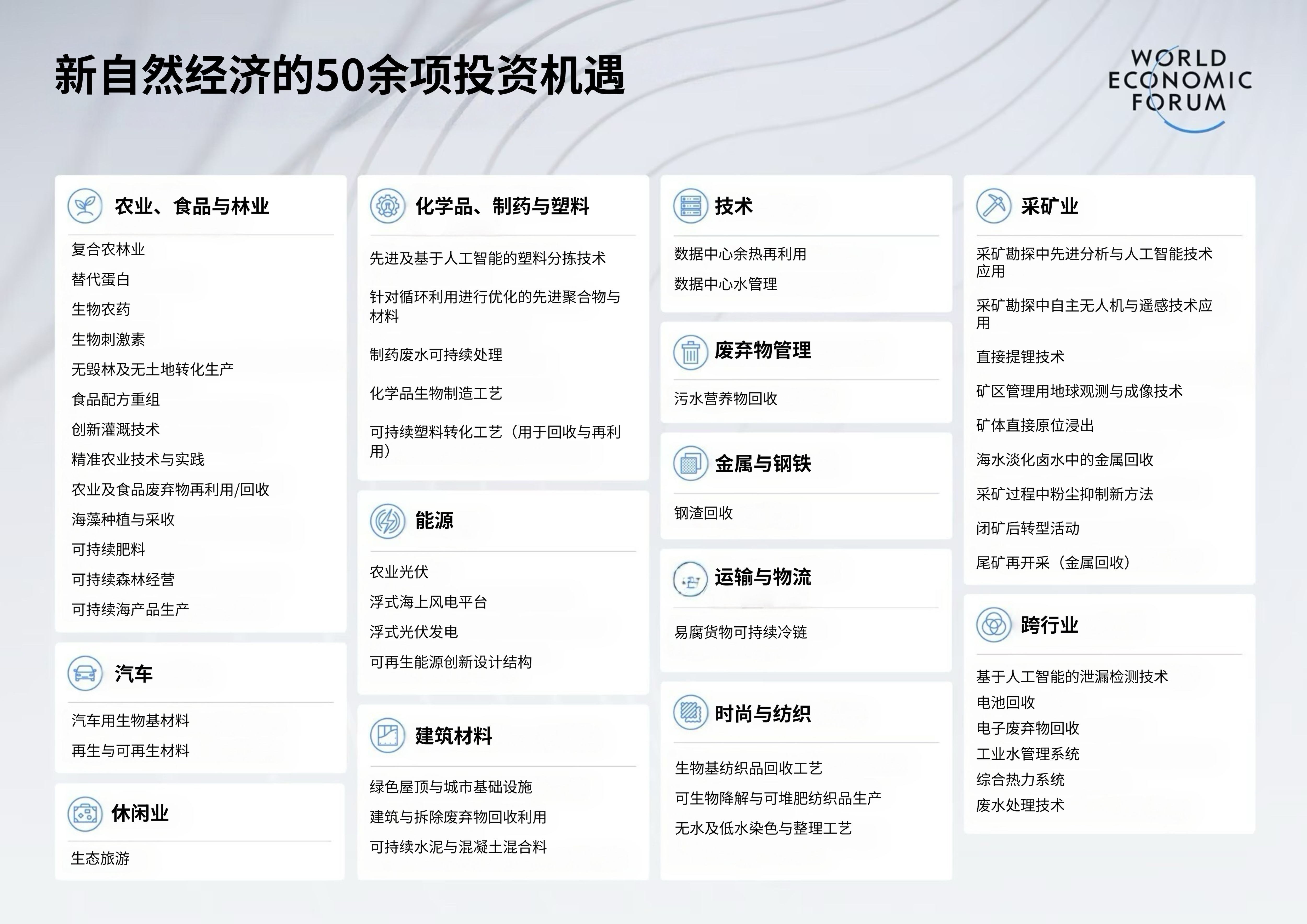 - 《新自然经济的可投资机会》报告列出了投资者可重点关注的50个经过严格评估的绿色领域。